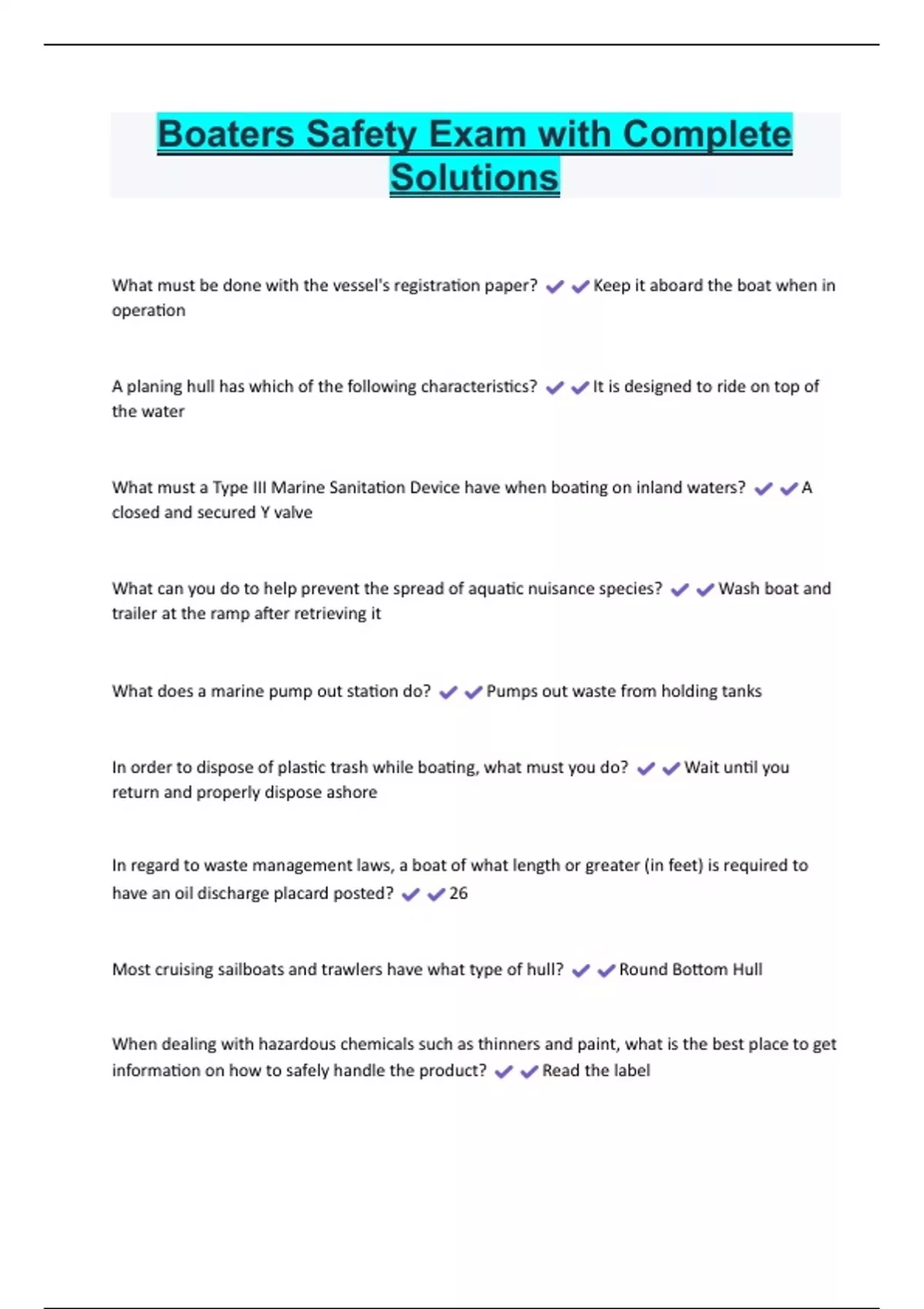 Boaters Safety Exam with Complete Solutions What must be done with the vessel's registration paper? Keep it aboard the boat when in operation A planing hull has which of the following characteristics? It is designed to ride on top of the water What must a Type III Marine Sanitation Device have when boating on inland waters? A closed and secured Y valve What can you do to help prevent the spread of aquatic nuisance species? Wash boat and trailer at the ramp after retrieving it What does a marine pump out station do? Pumps out waste from holding tanks In order to dispose of plastic trash while boating, what must you do? Wait until you