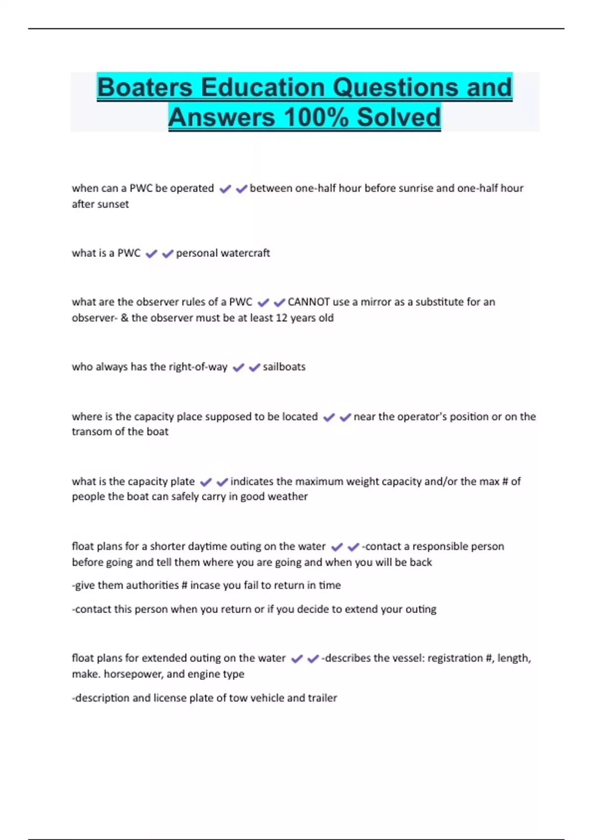 Boaters Education Questions and Answers 100% Solved when can a PWC be operated between one-half hour before sunrise and one-half hour after sunset what is a PWC personal watercraft what are the observer rules of a PWC CANNOT use a mirror as a substitute for an observer- & the observer must be at least 12 years old who always has the right-of-way sailboats where is the capacity place supposed to be located near the operator's position or on the transom of the boat what is the capacity plate indicates the maximum weight capacity and/or the max # of people the boat can safely carry in good weather float plans for a shorter daytime outing on the water -contact a responsible person before going and tell them where you are going and when you will be back