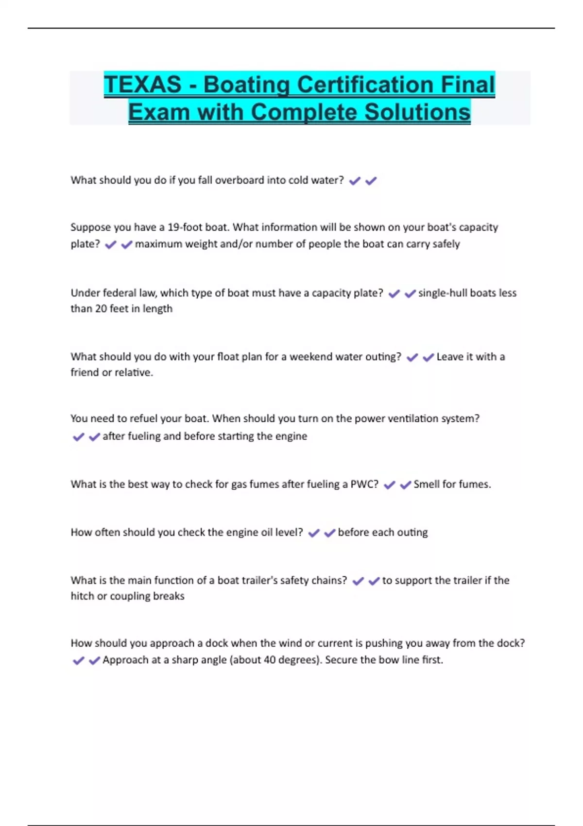 TEXAS - Boating Certification Final Exam with Complete Solutions What should you do if you fall overboard into cold water? Suppose you have a 19-foot boat. What information will be shown on your boat's capacity plate? maximum weight and/or number of people the boat can carry safely Under federal law, which type of boat must have a capacity plate? single-hull boats less than 20 feet in length What should you do with your float plan for a weekend water outing? Leave it with a friend or relative. You need to refuel your boat. When should you turn on the power ventilation system? after fueling and before starting the engine What is the best way to check for gas fumes after fueling a PWC? Smell for fumes. How often should you check the engine oil level? before each outin