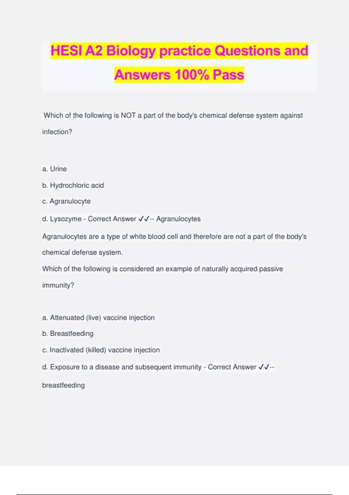 HESI A2 Biology practice Questions and Answers 100% Pass Which of the following is NOT a part of the body's chemical defense system against infection? a. Urine b. Hydrochloric acid c. Agranulocyte d. Lysozyme - Correct Answer ️️ -- Agranulocytes Agranulocytes are a type of white blood cell and therefore are not a part of the body's chemical defense system. Which of the following is considered an example of naturally acquired passive immunity? a. Attenuated (live) vaccine injection b. Breastfeeding c. Inactivated (killed) vaccine injection d. Exposure to a disease and subsequent immunity - Correct Answer ️️ -- breastfeeding Natural passive immunity occurs when live antibodies are transferred from one individual to another, such as when anti-bodies are transferred from a mother to her baby via breast milk. Worms lack which of the following? a. Eyes and brain b. Brain c. Eyes d. Nerve centers - Correct Answer ️️ -- eyes and brain Worms lack both eyes and a brain, but they do have nerve centers. Which organelle is responsible for generating ATP that is used for chemical energy? a. Mitochondria b. Vesicle c. Ribosome d. Golgi apparatus - Correct Answer ️️ -- mitochondria The mitochondrion is often referred to as the "power plant" of the cell, because it generates ATP, the cell's source of chemical energy. Which of the following is true with regard to eukaryotic and prokaryotic cells? a. Prokaryotic cells can contain lysosomes. b. Eukaryotic cells have mitochondria. c. Prokaryotic cells can contain lysosomes and eukaryotic cells have mitochondria. d. Prokaryotic cells have a nucleus. - Correct Answer ️️ -- Eukaryotic cells have mitochondria. One of the major differences between eukaryotic cells and prokaryotic cells is that eukaryotic cells contain organelles, such as mitochondria, whereas prokaryotic cells do not. Positive feedback is a mechanism used by the body that results in amplification or enhancement of a signal that has already been activated. An example of this would be: a. Slowing metabolism in response to starvation b. Shivering to increase temperature c. Blood vessels regulating blood pressure d. The release of oxytocin to increase contractions during childbirth - Correct Answer ️️ -- The release of oxytocin to increase contractions during childbirth Contractions in childbirth are considered a positive feedback loop because each contraction stimulates the brain to release more Oxytocin, which in turn stimulates more contractions. When placed in a hypotonic solution, a cell will do which of the following? a. Remain the same b. Disintegrate c. Swell d. Shrink - Correct Answer ️️ -- swell Water always moves from areas of higher concentration to lower concentration. A hypotonic solution contains less solutes and more water then the contents inside of the cell, so water will move from outside of the cell to inside, causing it to swell. Which is NOT an effect of photo-oxidation? a. Increase in tensile strength b. Discoloration c. Increase in brittleness d. Loss of surface smoothness - Correct Answer ️️ -- Increase in tensile strength Photo-oxidation occurs when UV light and ozone break down the surface of polymers. The result is the material becoming more brittle and discolored and less strong and smooth. The movement of a substance across a cell membrane from low to high concentration is known as what? a. Passive transport b. Diffusion c. Active transport d. Facilitated diffusion - Correct Answer ️️ -- Active transport Active transport is the movement of molecules against their concentration gradient, such as when moving from low to high concentration. During which stage of mitosis does the single cell split into two separate daughter cells? a. Telophase b. Cytokinesis c. Anaphase d. Prophase - Correct Answer ️️ -- Cytokinesis Cytokinesis occurs late in the process of mitosis and is marked by a single cell splitting into two daughter cells. Which of the following is NOT an example of an ecosystem? a. Marine b. Desert c. Ozone d. Grassland - Correct Answer ️️ -- Ozone An ecosystem is the interaction between living and non-living t