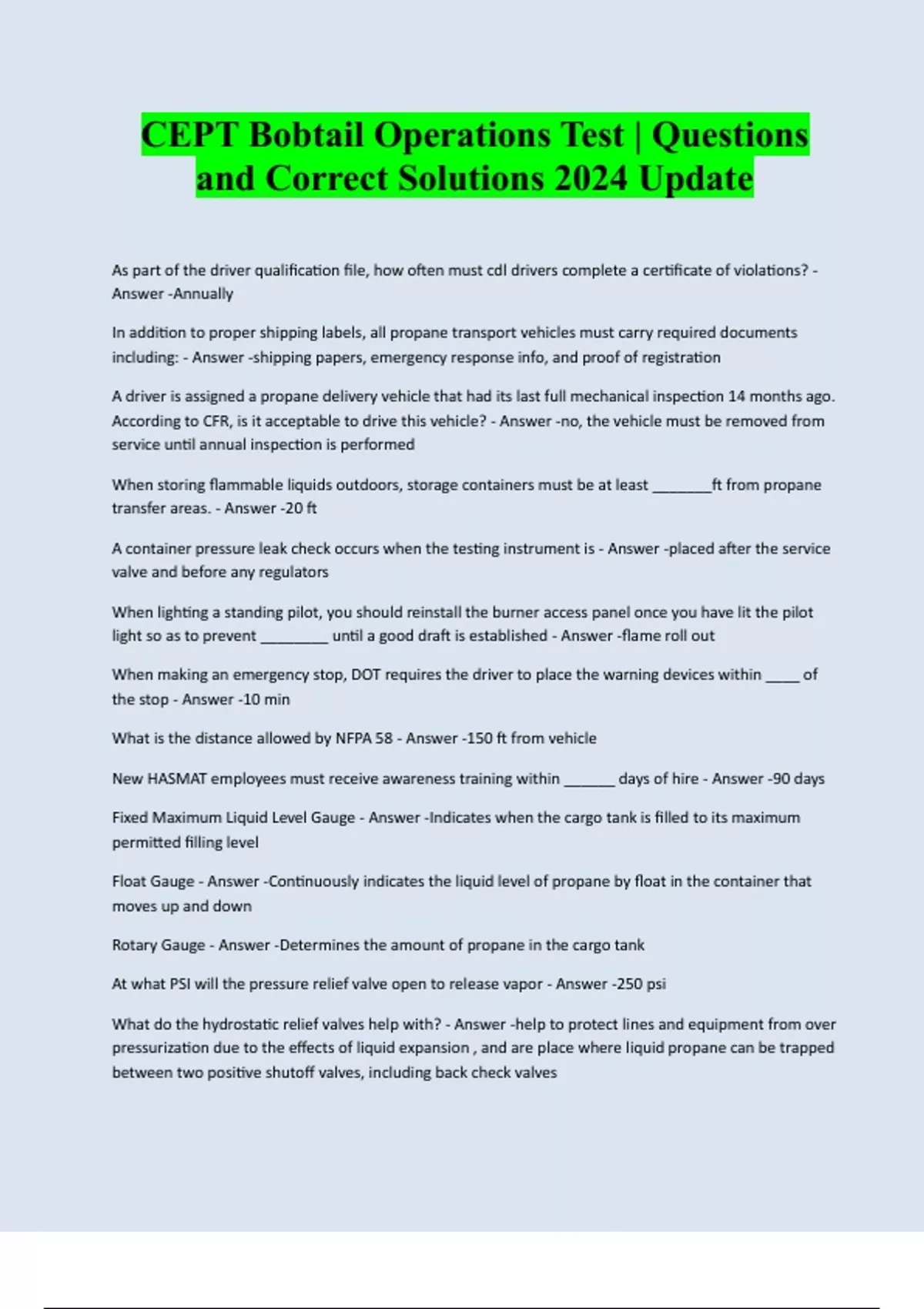 CEPT Bobtail Operations Test | Questions and Correct Solutions 2024 Update As part of the driver qualification file, how often must cdl drivers complete a certificate of violations? - Answer -Annually In addition to proper shipping labels, all propane transport vehicles must carry required documents including: - Answer -shipping papers, emergency response info, and proof of registration A driver is assigned a propane delivery vehicle that had its last full mechanical inspection 14 months ago. According to CFR, is it acceptable to drive this vehicle? - Answer -no, the vehicle must be removed from service until annual inspection is performed When storing flammable liquids outdoors, storage containers must be at least _______ft from propane transfer areas. - Answer -20 ft A container pressure leak check occurs when the testing instrument is - Answer -placed after the service valve and before any regulators