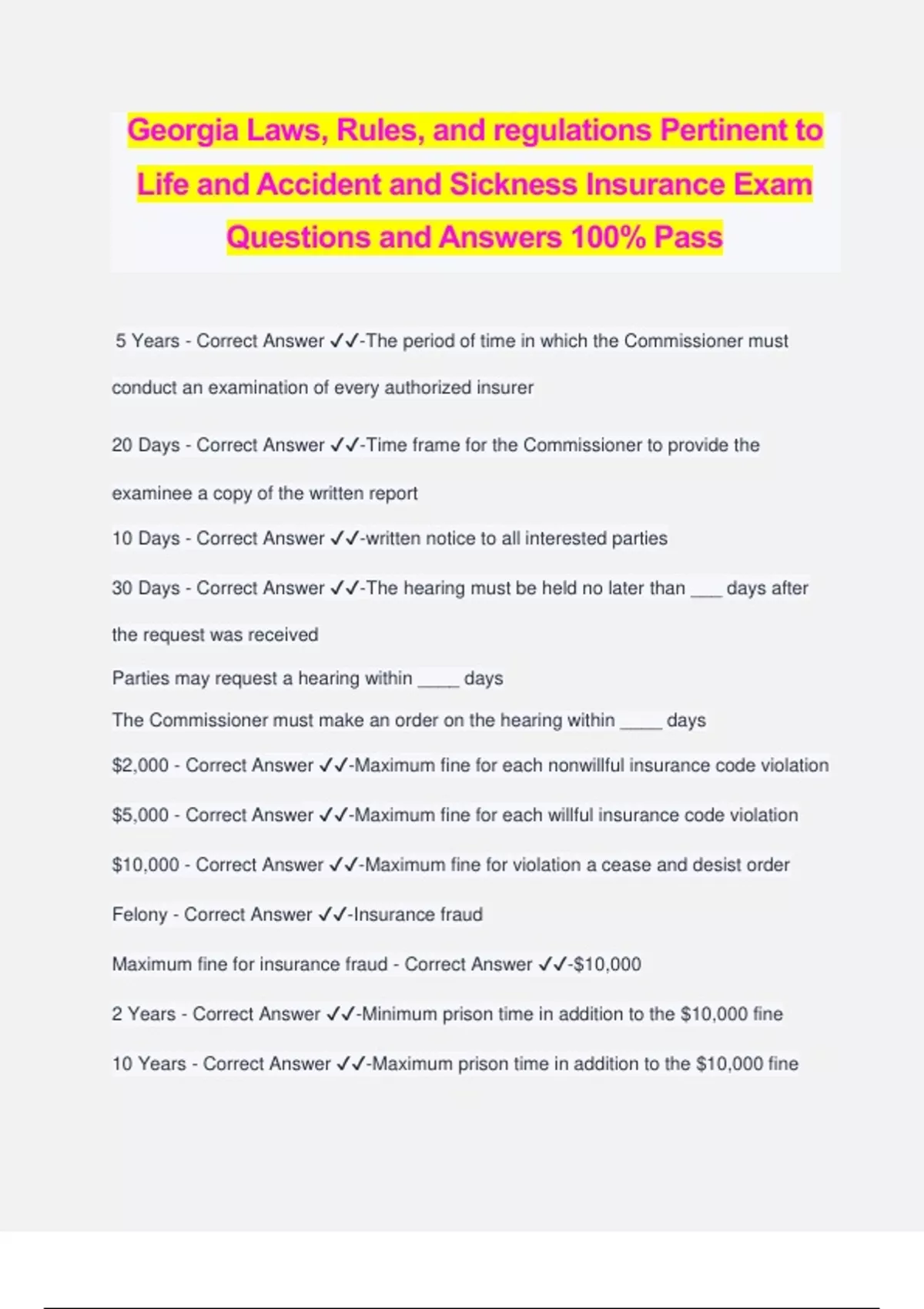Georgia Laws, Rules, and regulations Pertinent to Life and Accident and Sickness Insurance Exam Questions and Answers 100% Pass 5 Years - Correct Answer ✔️✔️-The period of time in which the Commissioner must conduct an examination of every authorized insurer 20 Days - Correct Ans wer ✔️✔️-Time frame for the Commissioner to provide the examinee a copy of the written report 10 Days - Correct Answer ✔️✔️-written notice to all interested parties 30 Days - Correct Answer ✔️✔️-The hearing must be held no later than ___ days after the request was received Parties may request a hearing within ____ days The Commissioner must make an order on the hearing within ____ days $2,000 - Correct Answer ✔️✔️-Maximum fine for each nonwillful insurance code violation $5,000 - Correct Answer ✔️✔️-Maximum fine for each willful insurance code violation $10,000 - Correct Answer ✔️✔️-Maximum fine for violation a cease and desist order Felony - Correct Answer ✔️✔️-Insurance fraud Maximum fine for insurance fraud - Correct Answer ✔️✔️-$10,000 2 Years - Correct Answer ✔️✔️-Minimum prison time in addition to the $10,000 fine 10 Years - Correct Answer ✔️✔️-Maximum prison time in addition to the $10,000 fine 3 Days - Correct Answer ✔️✔️-___ days notice required to temporarily suspend a license, if emergency action is needed The Association's maximum liability for any one life is as follows - Correct Answer ✔️✔️-