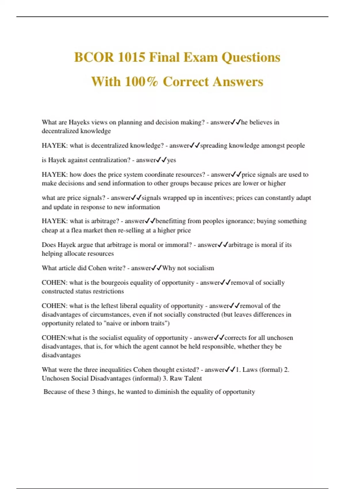 BCOR 1015 Final Exam Questions With 100% Correct Answers What are Hayeks views on planning and decision making? - answerhe believes in decentralized knowledge HAYEK: what is decentralized knowledge? - answerspreading knowledge amongst people is Hayek against centralization? - answeryes HAYEK: how does the price system coordinate resources? - answerprice signals are used to make decisions and send information to other groups because prices are lower or higher what are price signals? - answersignals wrapped up in incentives; prices can constantly adapt and update in response to new information HAYEK: what is arbitrage? - answerbenefitting from peoples ignorance; buying something cheap at a flea market then re-selling at a higher price Does Hayek argue that arbitrage is moral or immoral? - answerarbitrage is moral if its helping allocate resources What article did Cohen write? - answerWhy not socialism COHEN: what is the bourgeois equality of opportunity - answerremoval of socially constructed status restrictions COHEN: what is the leftest liberal equality of opportunity - answerremoval of the disadvantages of circumstances, even if not socially constructed (but leaves differences in opportunity related to "naive or inborn traits") COHEN:what is the socialist equality of opportunity - answercorrects for all unchosen disadvantages, that is, for which the agent cannot be held responsible, whether they be disadvantages What were the three inequalities Cohen thought existed? - answer1. Laws (formal) 2. Unchosen Social Disadvantages (informal) 3. Raw Talent Because of these 3 things, he wanted to diminish the equality of opportunity
