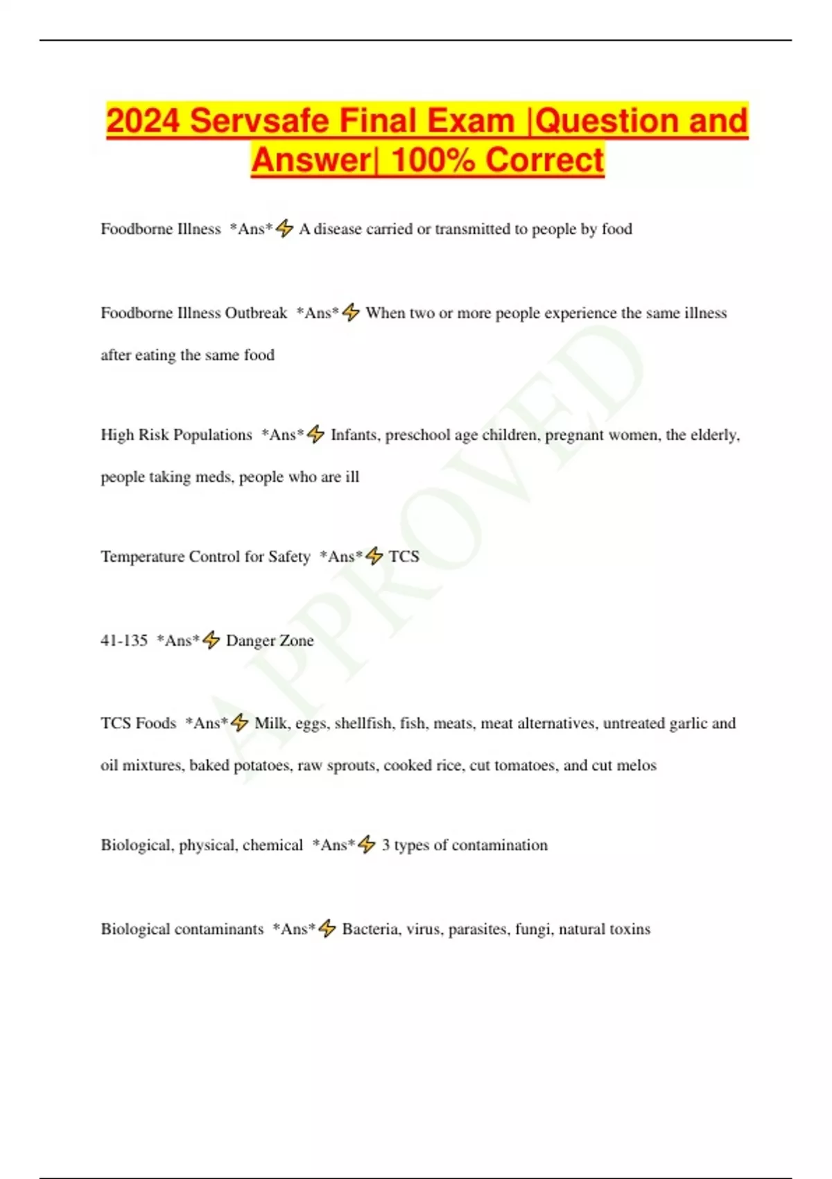 2024 Servsafe Final Exam |Question and Answer| 100% Correct Foodborne Illness *Ans* A disease carried or transmitted to people by food Foodborne Illness Outbreak *Ans* When two or more people experience the same illness after eating the same food High Risk Populations *Ans* Infants, preschool age children, pregnant women, the elderly, people taking meds, people who are ill Temperature Control for Safety *Ans* TCS 41-135 *Ans* Danger Zone TCS Foods *Ans* Milk, eggs, shellfish, fish, meats, meat alternatives, untreated garlic and oil mixtures, baked potatoes, raw sprouts, cooked rice, cut tomatoes, and cut melos Biological, physical, chemical *Ans* 3 types of contamination Biological contaminants *Ans* Bacteria, virus, parasites, fungi, natural toxins Chemical contaminants *Ans* Cleaners, sanitizers, toxic metal from Non Food Service Grade utensils and cookware, pesticides Physical contaminants *Ans* Foreign objects Top reasons for outbreak *Ans* 1. Purchasing food from unsafe sources 2. Failing to cook food adequately 3. Holding food at incorrect temps 4. Contaminated equipment 5. Poor personal hygiene TTC, cross contamination, poor personal hygiene *Ans* 3 ways food becomes contaminated Time- temperature abuse *Ans* TCS foods are left in the danger zone for more than 4 hours Cross contamination *Ans* Contaminants cross to a food that is not going to be cooked any further Poor personal hygiene *Ans* Food handlers cause foodborne illness Foodborne infections *Ans* When a person eats food containing pathogens Foodborne intoxications *Ans* Result when a person eats food containing pathogens, which then grow in the intestines and cause illness Bacteria *Ans* Found everywhere and under favorable conditions, can grow rapidly Food, Acidity, Temperature, Time, Oxygen, Moisture *Ans* FATTOM Viruses *Ans* Practicing good personal hygiene and minimizing bare hand contact with ready to eat food can help defend against Fish toxins *Ans* Scombroid and Ciguatera are Approved supplier *Ans* All produce should be purchased from an Allergic reaction *Ans* Itching, tightening of throat, wheezing, hives, swelling, diarrhea, vomiting, cramps, and loss of consciousness are all signs o