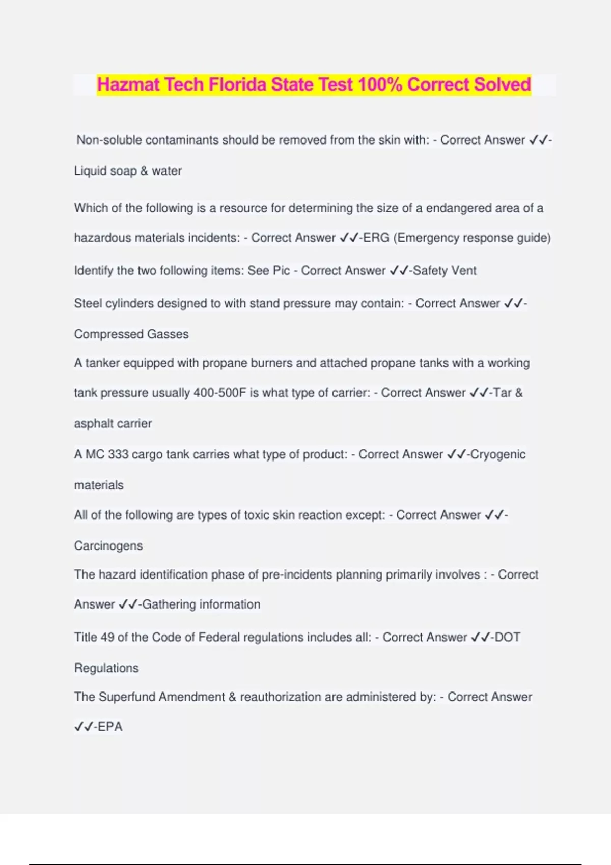 Hazmat Tech Florida State Test 100% Correct Solved Non-soluble contaminants should be removed from the skin with: - Correct Answer ️️ - Liquid soap & water Which of the following is a resource for determining the size of a endangered area of a hazardous materials incidents: - Correct Answer ️️ -ERG (Emergency response guide) Identify the two following items: See Pic - Correct Answer ️️ -Safety Vent Steel cylinders designed to with stand pressure may contain: - Correct Answer ️️ - Compressed Gasses A tanker equipped with propane burners and attached propane tanks with a working tank pressure usually 400-500F is what type of carrier: - Correct Answer ️️ -Tar & asphalt carrier A MC 333 cargo tank carries what type of product: - Correct Answer ️️ -Cryogenic materials All of the following are types of toxic skin reaction except: - Correct Answer ️️ - Carcinogens The hazard identification phase of pre-incidents planning primarily involves : - Correct Answer ️️ -Gathering information Title 49 of the Code of Federal regulations includes all: - Correct Answer ️️ -DOT Regulations The Superfund Amendment & reauthorization are administered by: - Correct Answer ️️ -EPA Compressed gases are defined by DOT as having a absolute pressure exceeding: - Correct Answer ️️ -40 psi at 70 F What measures the ability of a liquid to evaporate, that is, to change from a liquid to a gas: - Correct Answer ️️ -Vapor Pressure On a combustible gas indicator with a reading in % LRL, the reading indicate 0-100% of: - Correct Answer ️️ -The lower explosive limit Which of the following chemicals can produce methemoglobinemia: - Correct Answer ️️ -Nitrates The longest approved airline for supplied air respirators are: - Correct Answer ️️ -300 ft A placard with a Class Division number 4.2 at the bottom of the placard would be: - Correct Answer ️️ -Spontaneous combustible material How are subsidiary placards be distinguished from primary placards: - Correct Answer ️️ -Subsidiary placards do not carry class or UN number If your monitoring a gas with a LEL of 2% and your combustible gas indicator reading 50% LEL what is the actual percentage of gas in the atmosphere: - Correct Answer ️️ - 1% PID are generally used to detect: - Correct Answer ️️ -Organic vapors and gases in low ppm ranges Class 5 material such as ammonium nitrate fertilizers include what group: - Correct Answer ️️ -Organic Peroxides Carboxyhemoglobin occur when the carbon monoxide inhibits: - Correct Answer ️️ -the bloods inability to carry oxygen Asphyxiants is a substance: - Correct Answer ️️ -deprives the body of oxygen Victims of heat stroke experiences: - Correct Answer ️️ -Rapid, strong pulse & flushed dry skin A 'pyrophoric' materials describes a material that spontaneously ignites in air at or below : - Correct Answer ️️ -130F Substances added to monomers to prevent them from polymerizin