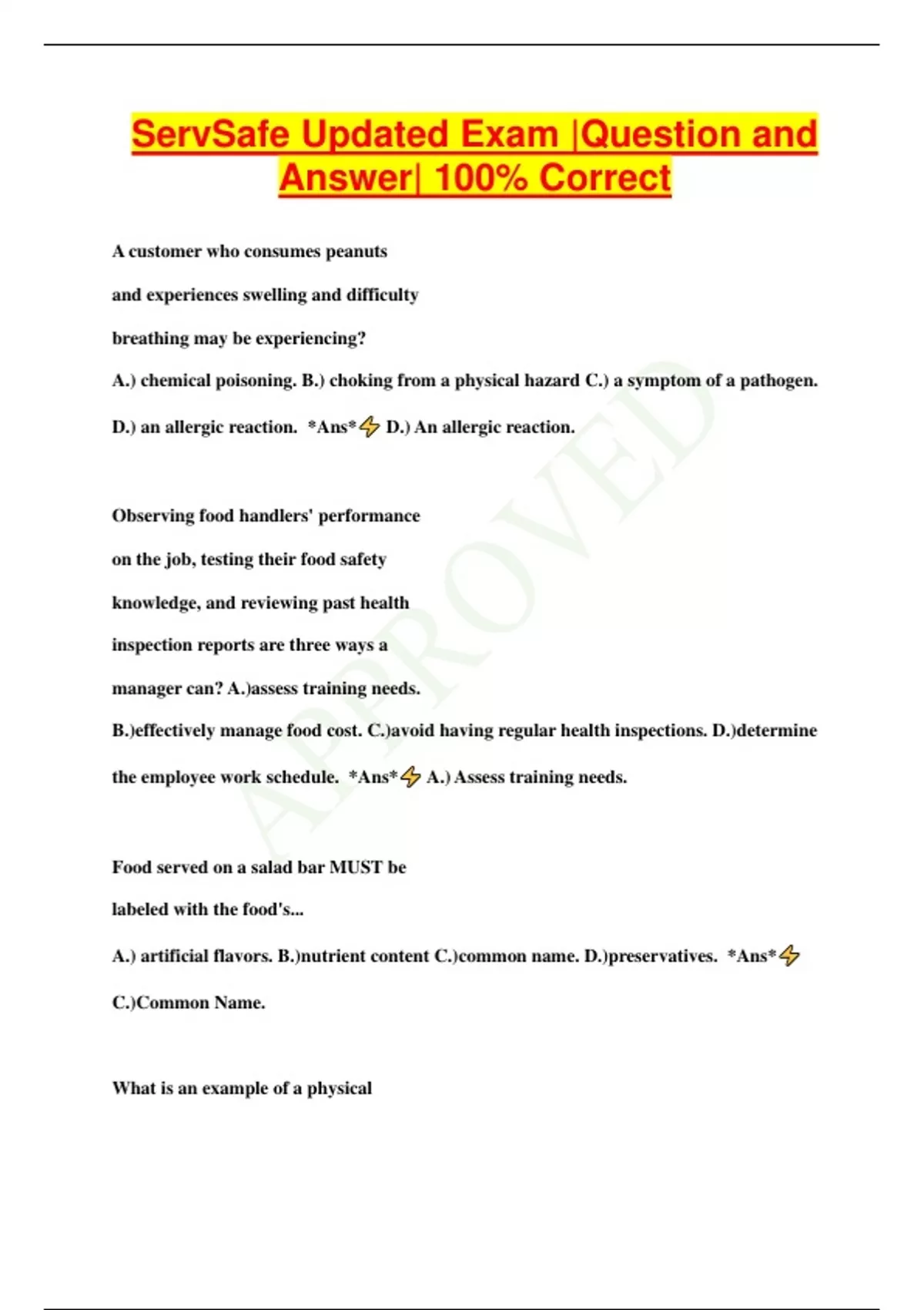 ServSafe Updated Exam |Question and Answer| 100% Correct A customer who consumes peanuts and experiences swelling and difficulty breathing may be experiencing? A.) chemical poisoning. B.) choking from a physical hazard C.) a symptom of a pathogen. D.) an allergic reaction. *Ans* D.) An allergic reaction. Observing food handlers' performance on the job, testing their food safety knowledge, and reviewing past health inspection reports are three ways a manager can? A.)assess training needs. B.)effectively manage food cost. C.)avoid having regular health inspections. D.)determine the employee work schedule. *Ans* A.) Assess training needs. Food served on a salad bar MUST be labeled with the food's... A.) artificial flavors. B.)nutrient content C.)common name. D.)preservatives. *Ans* C.)Common Name. What is an example of a physical contaminant? A.)Copper pot B.)Raw red kidney bean. C.)Piece of plastic D.)Toxic mushroom *Ans* C.) Piece of plastic Food handlers should wash their hands after... A.)working with ready-to-eat food and before handling raw food. B.)removing gloves and before handling trash. C.)engaging in activities that contaminate hands. D.)entering the restroom. *Ans* C.)Engaging in activities that contaminate hands Shigella spp. causes a foodborne illness that is transmitted by employees who fail to... A.)wash their hands. B.)change their gloves. C.)report their illness. D.)wear clean uniforms. *Ans* A.) Wash their hands. A seafood operation is located in a riverfront community known for its oysters. Each morning, the owner/operator harvests fresh oysters to shuck raw or cook for the customers. Is this practice legal? A.)No, because fresh molluscan shellfish such as oysters and clams must be inspected by the USDA. B.)No, because molluscan shellfish must be purchased from an approved supplier. C.)Yes, as long as the molluscan shellfish are stored at 41°F (5°C) or below before shucking or cooking. D.)Yes, as long as the operation is licensed by the local health department. *Ans* B.)No, because molluscan shellfish must be purchased from an approved supplier. Which example would be considered a physical contaminant? A.)Caterpillar found in a case of lettuce B.)Foul odor coming from fresh seafood C.)Buildup of heavy frost on frozen fruit D.) Seaweed in a container with live shellfish *Ans* A.) Caterpillar found in a case of lettuce When a food recall occurs, the operation must... A.)immediately notify customers. B.)immediately notify the Centers for Disease Control (CDC). C.) throw out all of the food item. D.) discontinue use of the food item. *Ans* D.) Discontinue use of the food item Besides chlorine, what are the chemical sanitizers approved for operations? A.) Ammonia and isopropyl alcohol B.)Hydrogen peroxide and quaternary ammonium. C.)iodine and quaternary ammonium D.)Isopropyl alcohol and hydrogen peroxide *Ans* C.) Iodine and quaternary ammonium The hair, nose, throat, and infected cuts