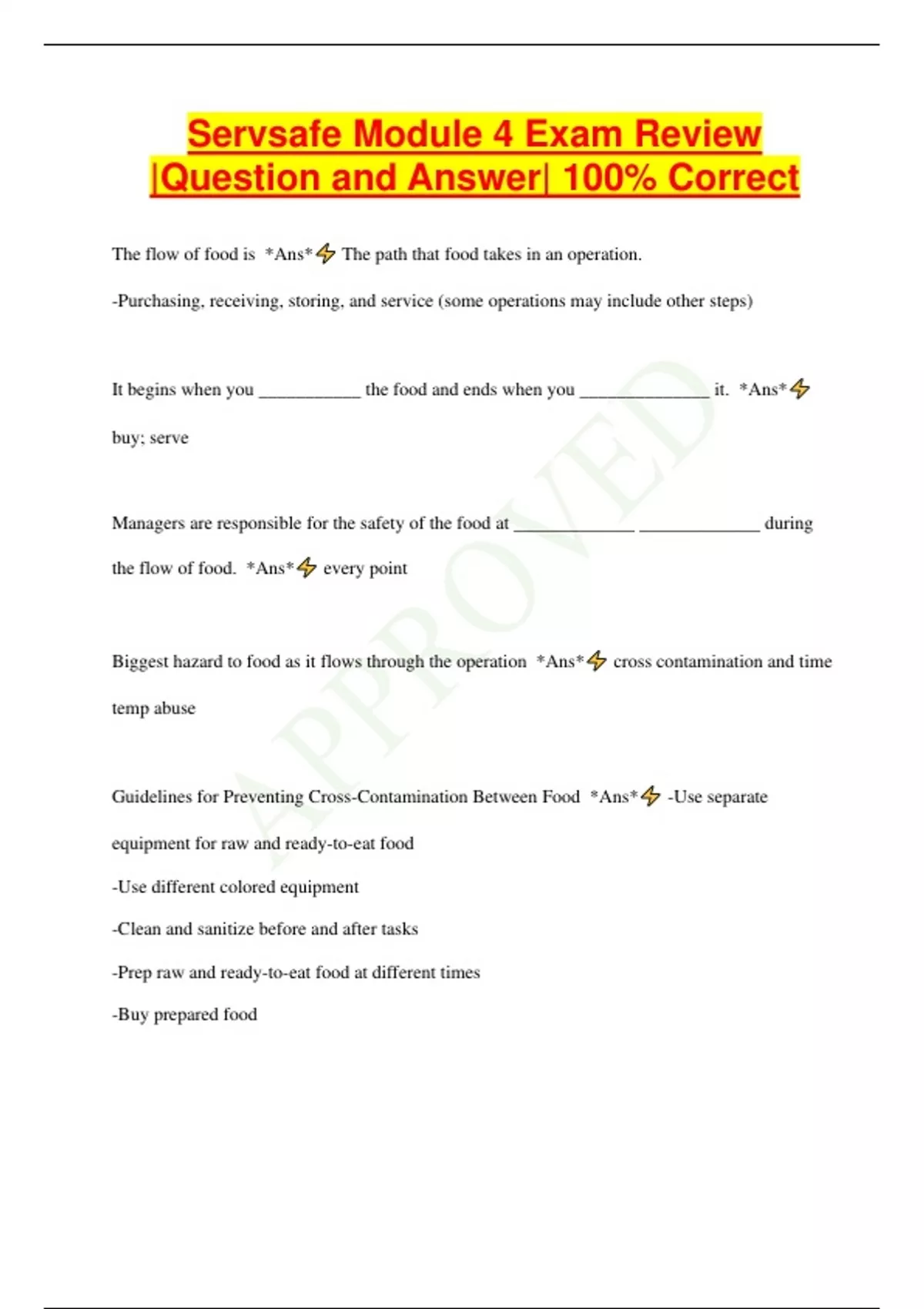 Servsafe Module 4 Exam Review |Question and Answer| 100% Correct The flow of food is *Ans* The path that food takes in an operation. -Purchasing, receiving, storing, and service (some operations may include other steps) It begins when you ___________ the food and ends when you ______________ it. *Ans* buy; serve Managers are responsible for the safety of the food at _____________ _____________ during the flow of food. *Ans* every point Biggest hazard to food as it flows through the operation *Ans* cross contamination and time temp abuse Guidelines for Preventing Cross-Contamination Between Food *Ans* -Use separate equipment for raw and ready-to-eat food -Use different colored equipment -Clean and sanitize before and after tasks -Prep raw and ready-to-eat food at different times -Buy prepared food Most foodborne illnesses happen because TCS food has been ____________ - ______________ abused. *Ans* time-temperature TCS food has been time-temperature abused any time it remains between ______________ and ________________. This is called the _________________ _______________ ___________ because pathogens grow in this range. Most pathogens grow much faster between _______________ and _______________. *Ans* 41 F and 135 F Temp Danger Zone 70 F and 125 F Food is being temperature abused whenever it is handled in the following ways: *Ans* cooked at the wrong internal temp held at the wrong temp cooled or reheated incorrectly The longer food stays in the temperature danger zone, the more time path