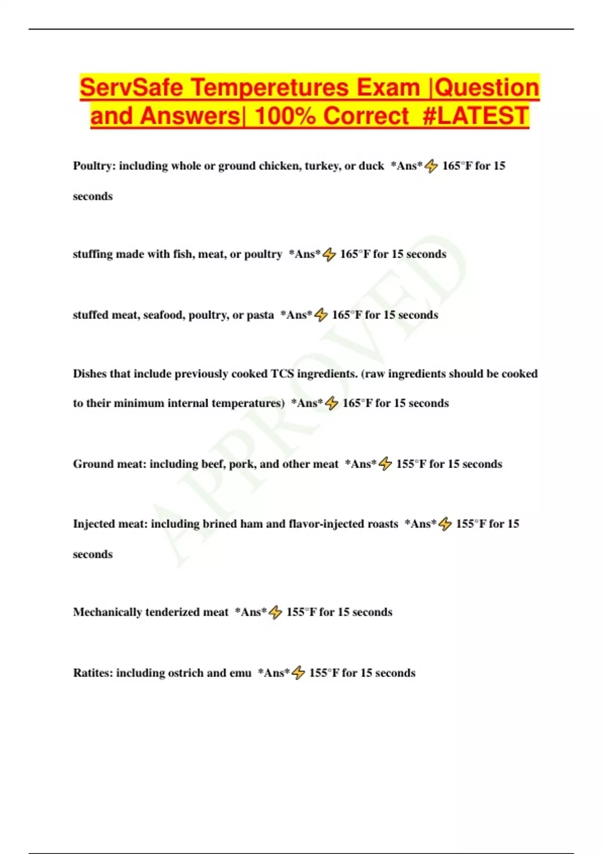 ServSafe Temperetures Exam |Question and Answers| 100% Correct #LATEST Poultry: including whole or ground chicken, turkey, or duck *Ans* 165°F for 15 seconds stuffing made with fish, meat, or poultry *Ans* 165°F for 15 seconds stuffed meat, seafood, poultry, or pasta *Ans* 165°F for 15 seconds Dishes that include previously cooked TCS ingredients. (raw ingredients should be cooked to their minimum internal temperatures) *Ans* 165°F for 15 seconds Ground meat: including beef, pork, and other meat *Ans* 155°F for 15 seconds Injected meat: including brined ham and flavor-injected roasts *Ans* 155°F for 15 seconds Mechanically tenderized meat *Ans* 155°F for 15 seconds Ratites: including ostrich and emu *Ans* 155°F for 15 seconds Ground seafood: including chopped or minced seafood *Ans* 155°F for 15 seconds Shell eggs hot-held for service *Ans* 155°F for 15 seconds Steaks/chops of pork, beef, veal, and lamb *Ans* 145°F for 15 seconds Seafood: including fish, shellfish, and crustaceans *Ans* 145°F for 15 seconds Commercially raised game *Ans* 145°F for 15 seconds Shell eggs that will be served immediately *Ans* 145°F for 15 seconds Roast of pork, beef, veal, and lamb *Ans* 145°F for 4 minutes Fruit, vegetables, grains (rice, pasta), and legumes (beans, refried beans) th