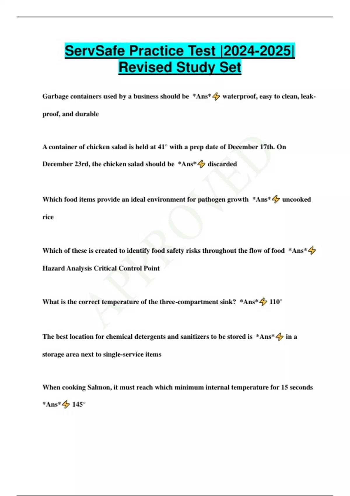 ServSafe Practice Test || Revised Study Set Garbage containers used by a business should be *Ans* waterproof, easy to clean, leakproof, and durable A container of chicken salad is held at 41° with a prep date of December 17th. On December 23rd, the chicken salad should be *Ans* discarded Which food items provide an ideal environment for pathogen growth *Ans* uncooked rice Which of these is created to identify food safety risks throughout the flow of food *Ans* Hazard Analysis Critical Control Point What is the correct temperature of the three-compartment sink? *Ans* 110° The best location for chemical detergents and sanitizers to be stored is *Ans* in a storage area next to single-service items When cooking Salmon, it must reach which minimum internal temperature for 15 seconds *Ans* 145° Which organization certifies and or classifies equipment for food preparation and sanitation *Ans* an ANSI accredited certification program Which foodborne illness is usually caused by incorrectly canned food? *Ans* Botulism Apart from ensuring that deli meats are stored at a safe cold-holding temperature, another food safety measure involves *Ans* date marking foods with a maximum of seven daysonce open or prepared What happens when non-potable water contaminates drinkable water? *Ans* crossconnection What is the final step in the process of cleaning and sanitizing stationary equipment? *Ans* sanitize and allow the surfaces and parts to air dry The minimum required temperature for the final hot water sanitizing rinse in a stationary rack single temperature machine is *Ans* 180° What is the meaning of the acronym FATTOM? *Ans* Conditions that favor the growth of most foodborne pathogens