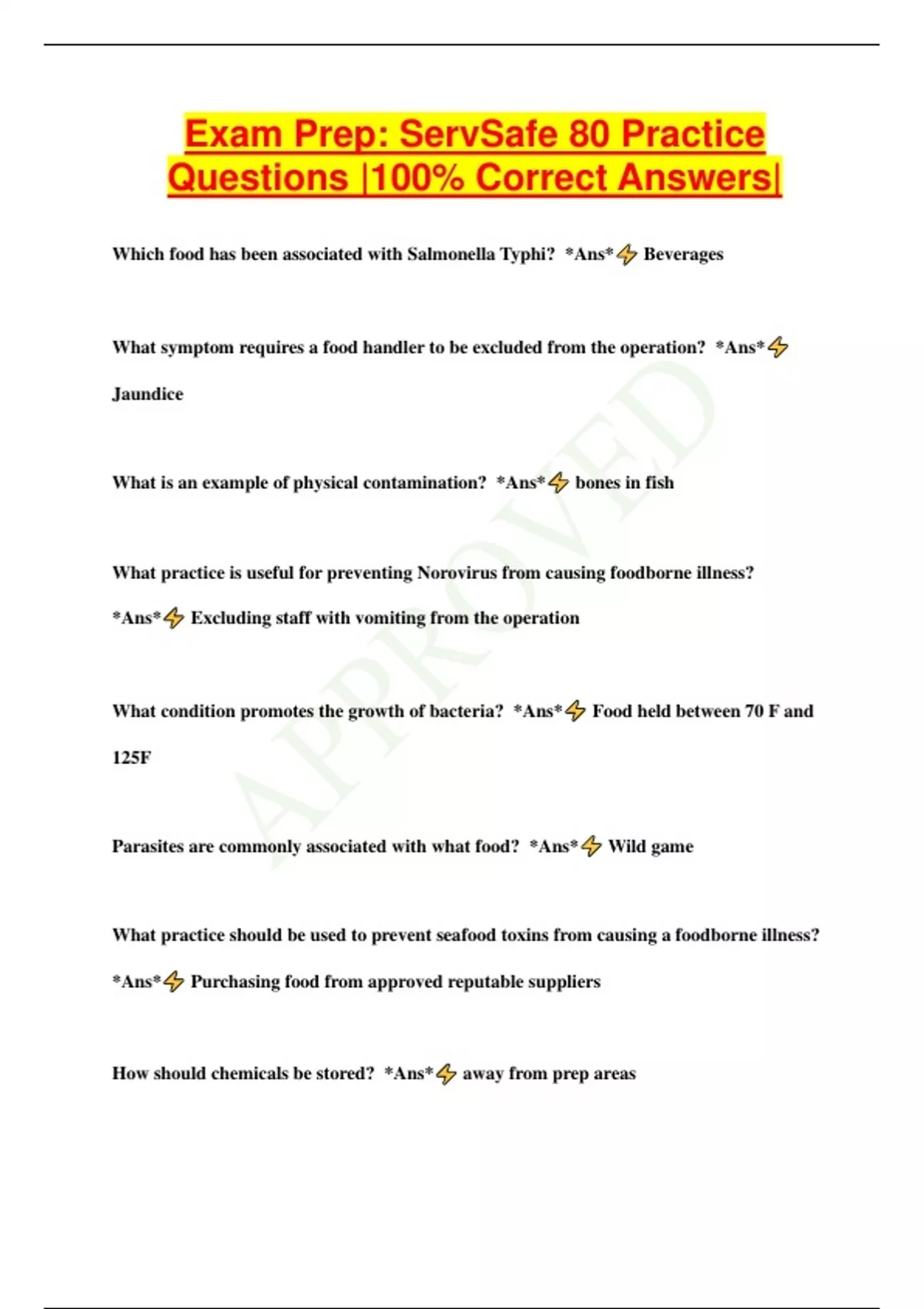 Exam Prep: ServSafe 80 Practice Questions |100% Correct Answers| Which food has been associated with Salmonella Typhi? *Ans* Beverages What symptom requires a food handler to be excluded from the operation? *Ans* Jaundice What is an example of physical contamination? *Ans* bones in fish What practice is useful for preventing Norovirus from causing foodborne illness? *Ans* Excluding staff with vomiting from the operation What condition promotes the growth of bacteria? *Ans* Food held between 70 F and 125F Parasites are commonly associated with what food? *Ans* Wild game What practice should be used to prevent seafood toxins from causing a foodborne illness? *Ans* Purchasing food from approved reputable suppliers How should chemicals be stored? *Ans* away from prep areas What does the L stand for in the FDA's ALERT tool? *Ans* LOOK What practice can help prevent allergic reactions? *Ans* Telling customers how an item is prepared What symptom can indicate that a customer is having an allergic reaction? *Ans* Wheezing or shortness of breath Where should a food handler wash his or her hands after prepping food? *Ans* Designated sink for handwashing When should a food handler with a sore throat and fever be excluded from the operation? *Ans* When the customers served are a primarily high risk population. A food handler comes to work with diarrhea. What should the manager tell the food handler to do? *Ans* Go home What should the food handler do to make gloves easier to put on? *Ans* select the correct size gloves When can a food handler diagnosed with jaundice return to work? *Ans* When approved by the regulatory authority What item is a potential physical contaminant? *Ans* jewelry What is the purpose of hand antiseptic? *Ans* L