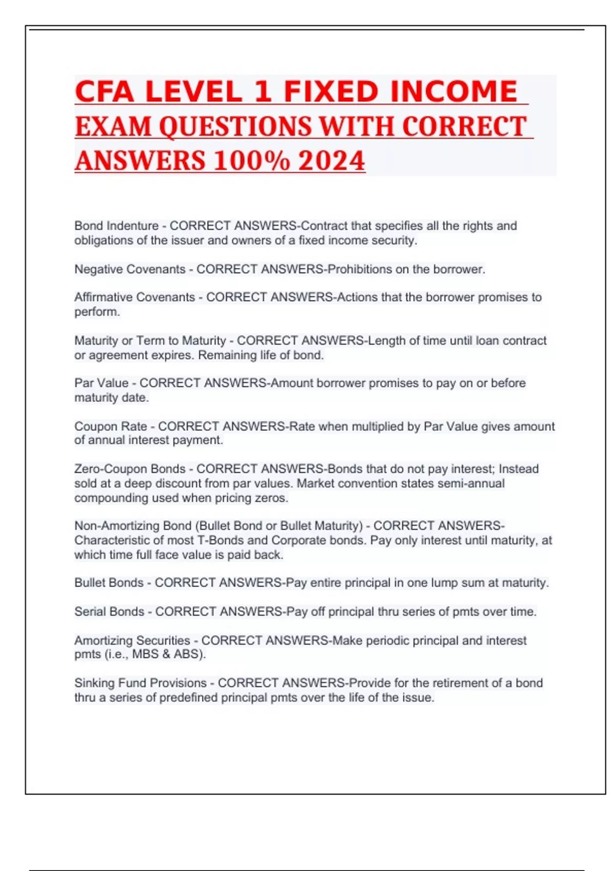 CFA LEVEL 1 FIXED INCOME EXAM QUESTIONS WITH CORRECT ANSWERS 100% 2024