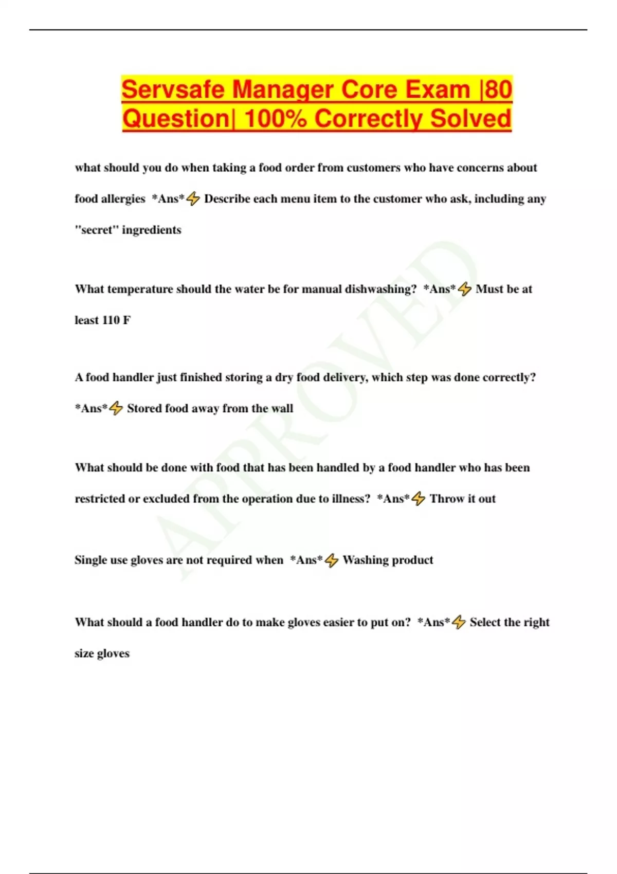 Servsafe Manager Core Exam |80 Question| 100% Correctly Solved what should you do when taking a food order from customers who have concerns about food allergies *Ans* Describe each menu item to the customer who ask, including any "secret" ingredients What temperature should the water be for manual dishwashing? *Ans* Must be at least 110 F A food handler just finished storing a dry food delivery, which step was done correctly? *Ans* Stored food away from the wall What should be done with food that has been handled by a food handler who has been restricted or excluded from the operation due to illness? *Ans* Throw it out Single use gloves are not required when *Ans* Washing product What should a food handler do to make gloves easier to put on? *Ans* Select the right size gloves What should food handlers do after leaving and returning to the prep area? *Ans* Wash hands What rule for serving bread should food handlers practice? *Ans* Do not re-serve uneaten bread What does the L stand for in the FDA'S ALERT tool? *Ans* Look What is the minimum internal cooking temp for chicken breasts? *Ans* 165°F (74 °C) for 15 seconds What factors influence the effectiveness of a chemical sanitizer? *Ans*