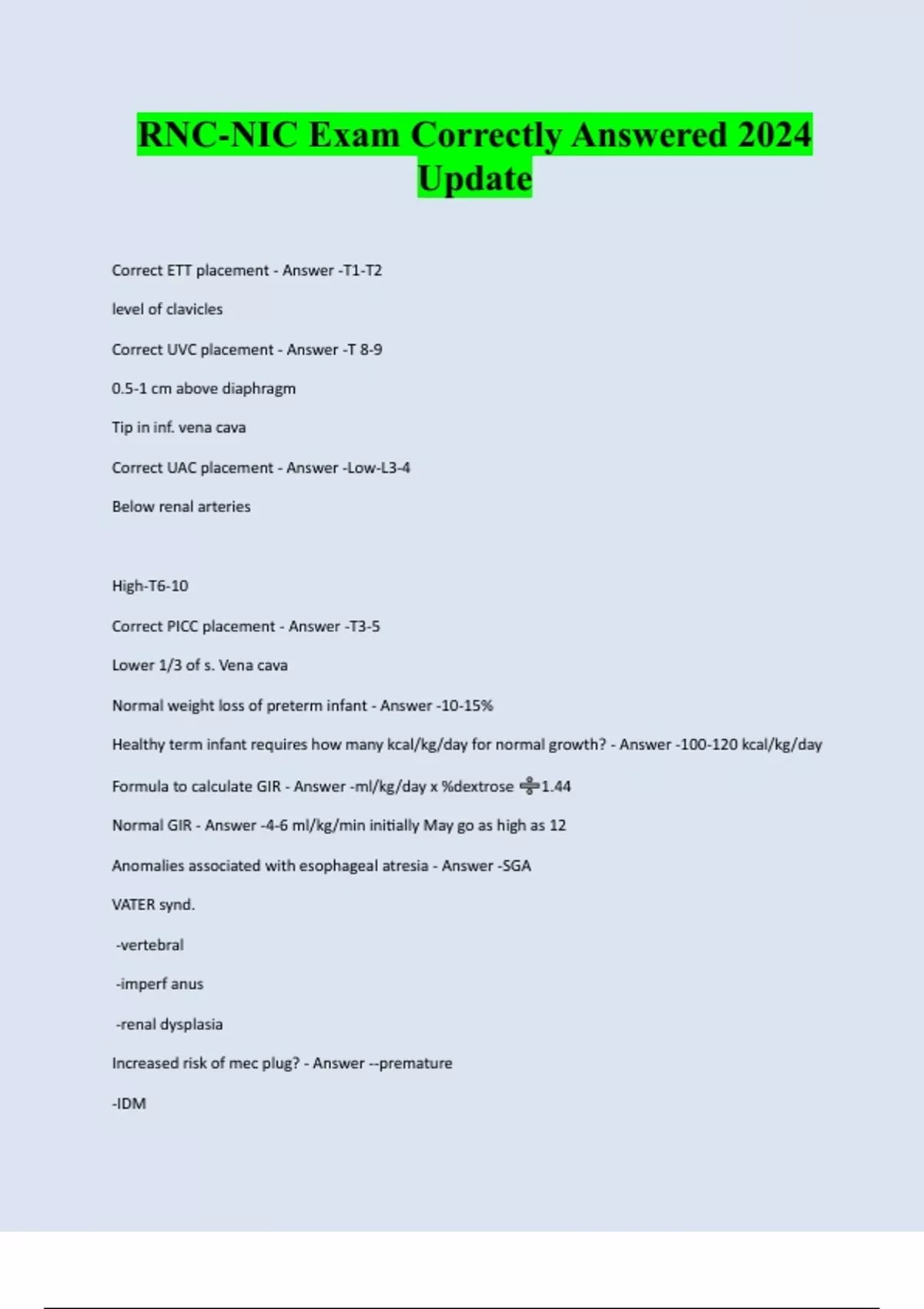 RNC-NIC Exam Correctly Answered 2024 Update Correct ETT placement - Answer -T1-T2 level of clavicles Correct UVC placement - Answer -T 8-9 0.5-1 cm above diaphragm Tip in inf. vena cava Correct UAC placement - Answer -Low-L3-4 Below renal arteries High-T6-10 Correct PICC placement - Answer -T3-5 Lower 1/3 of s. Vena cava Normal weight loss of preterm infant - Answer -10-15% Healthy term infant requires how many kcal/kg/day for normal growth? - Answer -100-120 kcal/kg/day Formula to calculate GIR - Answer -ml/kg/day x %dextrose 1.44 Normal GIR - Answer -4-6 ml/kg/min initially May go as high as 12 Anomalies associated with esophageal atresia - Answer -SGA VATER synd. -vertebral -imperf anus -renal dysplasia Increased risk of mec plug? - Answer --premature -IDM-small left colon -cystic fibrosis Signs of pyloric stenosis - Answer -Distended stomach on x-ray with little or no gas below duodenum Can palpate "olive" Present at 2 to 3 weeks of life with Bile stained vomiting Normal temp range axillary - Answer -36.5 to 37.4°C TTN vs RDS - Answer -Usually requires less