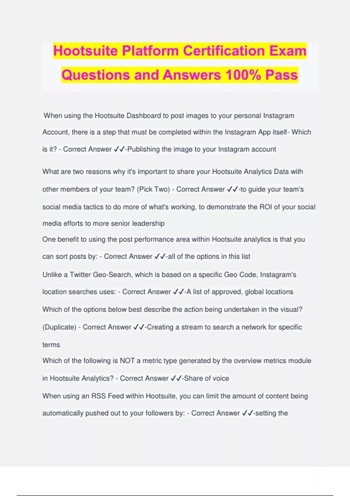 Hootsuite Platform Certification Exam Questions and Answers 100% Pass When using the Hootsuite Dashboard to post images to your personal Instagram Account, there is a step that must be completed within the Instagram App itself- Which is it? - Correct Answer ️️ -Publishing the image to your Instagram account What are two reasons why it's important to share your Hootsuite Analytics Data with other members of your team? (Pick Two) - Correct Answer ️️ -to guide your team's social media tactics to do more of what's working, to demonstrate the ROI of your social media efforts to more senior leadership One benefit to using the post performance area within Hootsuite analytics is that you can sort posts by: - Correct Answer ️️ -all of the options in this list Unlike a Twitter Geo-Search, which is based on a specific Geo Code, Instagram's location searches uses: - Correct Answer ️️ -A list of approved, global locations Which of the options below best describe the action being undertaken in the visual? (Duplicate) - Correct Answer ️️ -Creating a stream to search a network for specific terms Which of the following is NOT a metric type generated by the overview metrics module in Hootsuite Analytics? - Correct Answer ️️ -Share of voice When using an RSS Feed within Hootsuite, you can limit the amount of content being automatically pushed out to your followers by: - Correct Answer ️️ -setting the frequency that Hootsuite checks for new content to once a day, rather than once an hour Sometimes exchanges within a comment thread (In a stream) can become very long and hard to keep track of. If a particular thread is too important to miss, Hootsuite lets you quickly create a dedicated ______ for that conversation to stay on top of the action. - Correct Answer ️️ -Comment stream Which of the following is not a benefit of using Hootsuite Analytics? - Correct Answer ️️ -highly accurate estimates of the monetary value of each like, retweet, share, and new follower What are two best practices for discovering whether a message you've scheduled with Hootsuite has failed to send? (Pick Two) - Correct Answer ️️ -enable email notifications for failed messages under "Preferences" , review the "Past scheduled" calendar view in publisher for entries colored red When using the Hootsuite planner feature, the fastest way to compose a new message is to: - Correct Answer ️️ -click on a time slot and choose new post/ new pin In the composer, there are 3 ways you can attach an image. Which of the following in NOT an option for attaching an image? - Correct Answer ️️ -Insert an image from an instream tweet Unlike the overview module in Hootsuite Analytics, which offers one set of aggregated analytics data, _____ allows you to run an unlimited number of customizable and shareable real-time analytics reports, dialed precisely to the diverse reporting needs of your organization - Correct Answer ️️ -the reports feature When using Hootsuite to publish to Instagram, there are some types of posts that require using the "Mobile Notification Workflow"?, which involves a few additional steps. Pick the post type below that does NOT require using the "Mobile Notification Workflow"?. - Correct Answer ️️ -Image posted to a business account It's important to ensure you've done the following steps when scheduling messages using the Hootsuite bulk compose feature. (Pick two) - Correct Answer ️️ -input the date in MONTH, DAY, YEAR or DAY, MONTH, YEAR format ensure you use a 24-hour clock format Conversations on Twitter move fast and it's easy to miss the opportunity to engage with an important influencer or prospect. ____ are a great way to group together similar people and topics in twitter so you can focus on activity within a group without distractions. - Correct Answer ️️ -Twitter lists Within a Hootsuite Analytics Report, you can add a tile, which is: - Corre