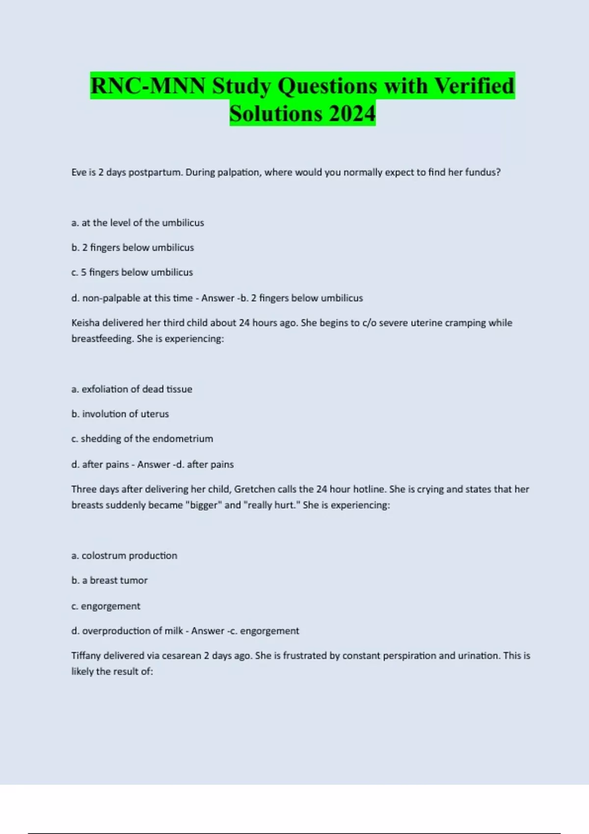 RNC-MNN Study Questions with Verified Solutions 2024 Eve is 2 days postpartum. During palpation, where would you normally expect to find her fundus? a. at the level of the umbilicus b. 2 fingers below umbilicus c. 5 fingers below umbilicus d. non-palpable at this time - Answer -b. 2 fingers below umbilicus Keisha delivered her third child about 24 hours ago. She begins to c/o severe uterine cramping while breastfeeding. She is experiencing: a. exfoliation of dead tissue b. involution of uterus c. shedding of the endometrium d. after pains - Answer -d. after pains Three days after delivering her child, Gretchen calls the 24 hour hotline. She is crying and states that her breasts suddenly became "bigger" and "really hurt." She is experiencing: a. colostrum production b. a breast tumor c. engorgement d. overproduction of milk - Answer -c. engorgement Tiffany delivered via cesarean 2 days ago. She is frustrated by constant perspiration and urination. This is likely the result of:a. changes in urine pH and a possible UTI b. drinking too much fluid in the early postpartum period c. the body's removal of fluids accumulated during pregnancy d. receiving excessive amounts of IV fluids during labor - Answer -c. the body's removal of fluids accumulated during pregnancy While assessing Sierra, a 32yo mother of 3, you notice uterine bleeding and find that her uterus is displayed upward and to the right. This is probably cause by: a. retained placental fragments b. rupture of the uterus c. distention of the bladd