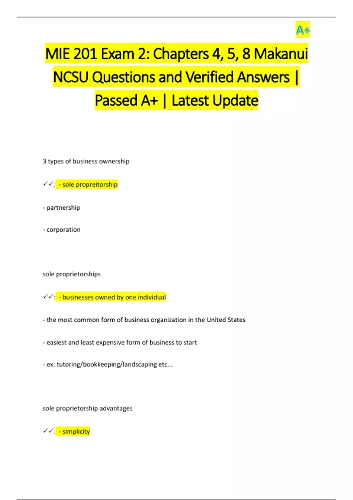 MIE 201 Exam 2: Chapters 4, 5, 8 Makanui NCSU Questions and Verified Answers | Passed A+ | Latest Update