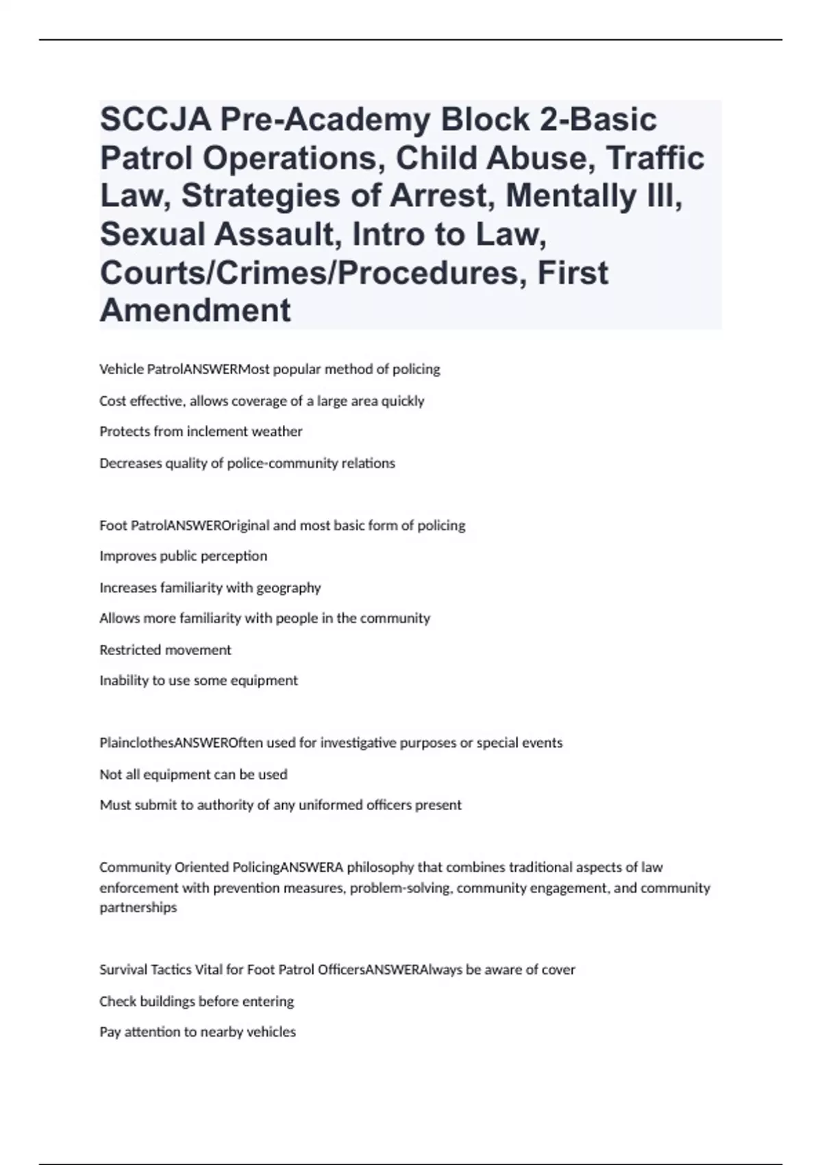 SCCJA Pre-Academy Block 2-Basic Patrol Operations, Child Abuse, Traffic Law, Strategies of Arrest, Mentally Ill, Sexual Assault, Intro to Law, Courts/Crimes/Procedures, First Amendment Exam Questions And Answers (GRADED +)