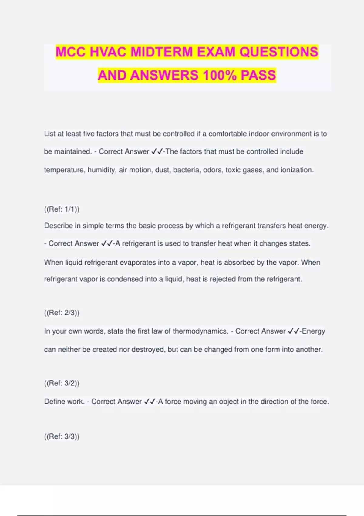 MCC HVAC MIDTERM EXAM QUESTIONS AND ANSWERS 100% PASS List at least five factors that must be controlled if a comfortable indoor environment is to be maintained. - Correct Answer ️️ -The factors that must be controlled include temperature, humidity, air motion, dust, bacteria, odors, toxic gases, and ionization. ((Ref: 1/1)) Describe in simple terms the basic process by which a refrigerant transfers heat energy. - Correct Answer ️️ -A refrigerant is used to transfer heat when it changes states. When liquid refrigerant evaporates into a vapor, heat is absorbed by the vapor. When refrigerant vapor is condensed into a liquid, heat is rejected from the refrigerant. ((Ref: 2/3)) In your own words, state the first law of thermodynamics. - Correct Answer ️️ -Energy can neither be created nor destroyed, but can be changed from one form into another. ((Ref: 3/2)) Define work. - Correct Answer ️️ -A force moving an object in the direction of the force. ((Ref: 3/3)) One horsepower (1 hp) of mechanical energy is equivalent to ______watts of electrical energy, and one watt (1 W) of electrical energy is equivalent to ________ Btu of heat energy. - Correct Answer ️️ -746 Watts, 3.413 Btu ((Ref: 3/4, 5)) In your own words, state the second law of thermodynamics. - Correct Answer ️️ -A temperature difference must exist between two materials in order for heat energy to travel. ((Ref: 3/7)) Heat always travels from a(n) _____ material to a(n) ______ material. - Correct Answer ️️ -Higher-temperature, lower-temperature. ((Ref: 37-4/1)) Temperature is a measurement of heat _____. British thermal units and calories are measurements of heat _____. - Correct Answer ️️ -Intensity, quantity ((Ref: 5/1)) What is the difference between latent heat and sensible heat? - Correct Answer ️️ - Latent heat causes a change in the state of a substance without a change in its temperature. Sensible heat causes a change in the temperature of substance without a change in its state. ((Ref: 6/1)) The latent heat of _____ causes a change in phase from vapor to liquid. The latent heat of _____ causes a change in phase from liquid to vapor. - Correct Answer ️️ - Condensation, vaporization. ((Ref: 6/1)) What is specific heat? - Correct Answer ️️ -Specific heat is the energy required to raise the temperature of 1 lb of a substance by 1 degree F. ((Ref: 6/3)) What is superheat? - Correct Answer ️️ -Superheat is energy that raises the temperature of a vapor above its saturation temperature. ((Ref: 6/4)) Convert 68 degrees F to an equivalent Celsius temperature. - Correct Answer ️️ -68 degrees minus 32, divided by 1.8 = 20 degrees Celsius ((Ref: 7/2)) Convert 25 degrees Celsius to an equivalent Fahrenheit temperature. - Correct Answer ️️ -25 times 1.8, plus 32 ((Ref: 7/2)) Absolute zero on the Fahrenheit scale is _____ ^0F - Correct An