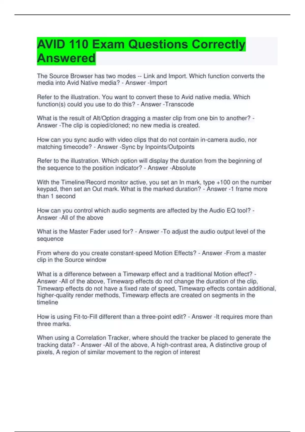 AVID 110 Exam Questions Correctly Answered The Source Browser has two modes -- Link and Import. Which function converts the media into Avid Native media? - Answer -Import Refer to the illustration. You want to convert these to Avid native media. Which function(s) could you use to do this? - Answer -Transcode What is the result of Alt/Option dragging a master clip from one bin to another? - Answer -The clip is copied/cloned; no new media is created. How can you sync audio with video clips that do not contain in-camera audio, nor matching timecode? - Answer -Sync by Inpoints/Outpoints Refer to the illustration. Which option will display the duration from the beginning of the sequence to the position indicator? - Answer -Absolute