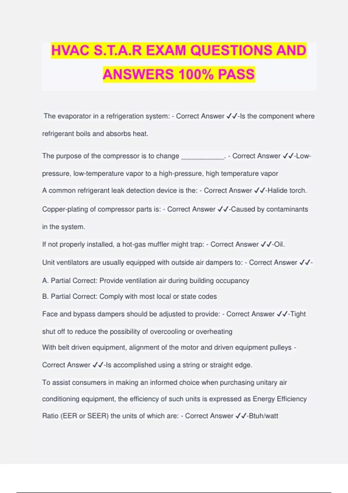 HVAC S.T.A.R EXAM QUESTIONS AND ANSWERS 100% PASS The evaporator in a refrigeration system: - Correct Answer ️️ -Is the component where refrigerant boils and absorbs heat. The purpose of the compressor is to change ___________. - Correct Answer ️️ -Low- pressure, low-temperature vapor to a high-pressure, high temperature vapor A common refrigerant leak detection device is the: - Correct Answer ️️ -Halide torch. Copper-plating of compressor parts is: - Correct Answer ️️ -Caused by contaminants in the system. If not properly installed, a hot-gas muffler might trap: - Correct Answer ️️ -Oil. Unit ventilators are usually equipped with outside air dampers to: - Correct Answer ️️ - A. Partial Correct: Provide ventilation air during building occupancy B. Partial Correct: Comply with most local or state codes Face and bypass dampers should be adjusted to provide: - Correct Answer ️️ -Tight shut off to reduce the possibility of overcooling or overheating With belt driven equipment, alignment of the motor and driven equipment pulleys - Correct Answer ️️ -Is accomplished using a string or straight edge. To assist consumers in making an informed choice when purchasing unitary air conditioning equipment, the efficiency of such units is expressed as Energy Efficiency Ratio (EER or SEER) the units of which are: - Correct Answer ️️ -Btuh/watt Firestats located in the air stream of air handling units: - Correct Answer ️️ -A. Partially Correct: Are required in both the supply and return air streams B. Partially Correct: Should be the manual reset type C. Partially Correct: Should be nonadjustable A sleeve bearing would typically be used in a motor that: - Correct Answer ️️ - Operates with a light load and where noise is a factor. A bearing used on the bottom of a motor where the shaft is positioned vertically is called a ____________ bearing. - Correct Answer ️️ -Thrust To produce electromagnetism, relative motion is required between a magnetic field and a/an: - Correct Answer ️️ -Conductor Materials which do not allow their electrons to spin out of orbit easily are called: - Correct Answer ️️ -Insulators A battery is an example of a/an ____________ source. - Correct Answer ️️ -Direct current "Current flowing through a conductor in one direction for a split second, then in the opposite direction for a split second" would be a good definition of: - Correct Answer ️️ -Alternating current If a pressure gauge reads five psig at sea level elevation, the corresponding absolute pressure is ___________ psia. - Correct Answer ️️ -Fractional The portion of the electromagnetic spectrum to which solar collectors respond is _____ and near-infrared radiation. - Correct Answer ️️ -Visible light During winter, ________. - Correct Answer ️️ -Daylight is shorter and the Northern Hemisphere is angled away from the sun Unless equipped with OSHA or Canadian Standards Association (CSA) approved ground-fault circuit interrupters, portable electric lighting used in wet and-or other conductive locations as, for example, drums, tanks and vessels, shall be operated at ______ volts or less. - Correct Answer ️️ -12 Receivers are usually required in systems having: - Correct Answer