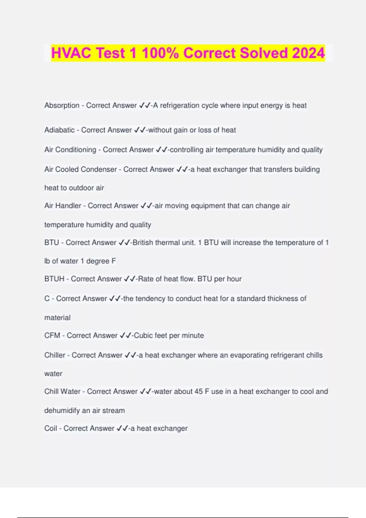 HVAC Test 1 100% Correct Solved 2024 Absorption - Correct Answer ️️ -A refrigeration cycle where input energy is heat Adiabatic - Correct Answer ️️ -without gain or loss of heat Air Conditioning - Correct Answer ️️ -controlling air temperature humidity and quality Air Cooled Condenser - Correct Answer ️️ -a heat exchanger that transfers building heat to outdoor air Air Handler - Correct Answer ️️ -air moving equipment that can change air temperature humidity and quality BTU - Correct Answer ️️ -British thermal unit. 1 BTU will increase the temperature of 1 lb of water 1 degree F BTUH - Correct Answer ️️ -Rate of heat flow. BTU per hour C - Correct Answer ️️ -the tendency to conduct heat for a standard thickness of material CFM - Correct Answer ️️ -Cubic feet per minute Chiller - Correct Answer ️️ -a heat exchanger where an evaporating refrigerant chills water Chill Water - Correct Answer ️️ -water about 45 F use in a heat exchanger to cool and dehumidify an air stream Coil - Correct Answer ️️ -a heat exchanger Condensation - Correct Answer ️️ -Change of state from vapor to liquid; heat is released Constant Volume - Correct Answer ️️ -HVAC equipment that controls room temperature by controlling the temperature of conditioning air Cooling Tower - Correct Answer ️️ -a heat exchanger that transfers building heat to outdoor air by evaporating water COP - Correct Answer ️️ -coefficient of performance Deck - Correct Answer ️️ -A heat exchanger Dehumidify - Correct Answer ️️ -Remove moisture Dry Bulb Temperature - Correct Answer ️️ -temperature indicated by a standard thermometer DX - Correct Answer ️️ -Direct expansion EA - Correct Answer ️️ -Exhaust air Economizer - Correct Answer ️️ -cooling with outdoor air Emissivity - Correct Answer ️️ -tendency of a surface to radiate heat Enthalpy - Correct Answer ️️ -sum of sensible and latent heat of a substance Entropy - Correct Answer ️️ -Tendency toward uniform inertness Evaporation - Correct Answer ️️ -change of state from liquid to vapor Evaporator - Correct Answer ️️ -a heat exchanger where evaporating refrigerant cools an air stream FPM - Correct Answer ️️ -feet per minute (velocity) GPM - Correct Answer ️️ -Gallons per minute. Quality of fluid flow Grain - Correct Answer ️️ -1/7000 of a pound Head - Correct Answer ️️ -total mechanical energy in a flu