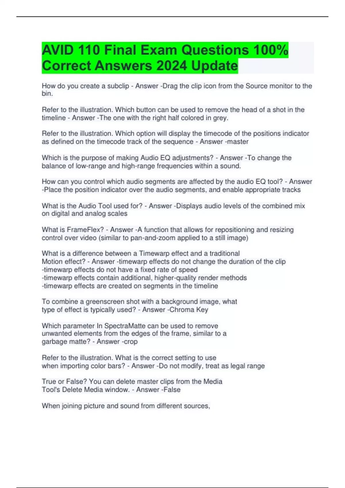 AVID 110 Final Exam Questions 100% Correct Answers 2024 Update How do you create a subclip - Answer -Drag the clip icon from the Source monitor to the bin. Refer to the illustration. Which button can be used to remove the head of a shot in the timeline - Answer -The one with the right half colored in grey. Refer to the illustration. Which option will display the timecode of the positions indicator as defined on the timecode track of the sequence - Answer -master Which is the purpose of making Audio EQ adjustments? - Answer -To change the balance of low-range and high-range frequencies within a sound. How can you control which audio segments are affected by the audio EQ tool? - Answer -Place the position indicator over the audio segments, and enable appropriate tracks What is the Audio Tool used for? - Answer -Displays audio levels of the combined mix on digital and analog scales What is FrameFlex? - Answer -A function that allows for repositioning and resizing control over video (similar to pan-and-zoom applied to a still image) What is a difference between a Timewarp effect and a traditional Motion effect? - Answer -timewarp effects do not change the duration of the clip -timewarp effects do not have a fixed rate of speed -timewarp effects contain additional, higher-quality render methods -timewarp effects are created on segments in the timeline To combine a greenscreen shot with a background image, what type of effect is typically used? - Answer -Chroma Key Which parameter In SpectraMatte can be used to remove unwanted elements from the edges of the frame, similar to a garbage matte? - Answer -crop Refer to the illustration. What is the correct setting to use when importing color bars? - Answer -Do not modify, treat as legal range True or False? You can delete master clips from the Media Tool's Delete Media window. - Answer -False When joining picture and sound from different sources, which can be used as a sync point? - Answer -IN/OUT Points, Source Timecode, and Aux Timecode What is the difference between "Find" and "Find Bin"? - Answer -"Find" tool searches across all metadata in the project while "Find Bin" finds the original bin in which a clip is stored. True or False? Using FrameFlex is a one-time option: Once you apply the reframing, a file is created, and you can no longer reframe the native high resolution clip - Answer -False