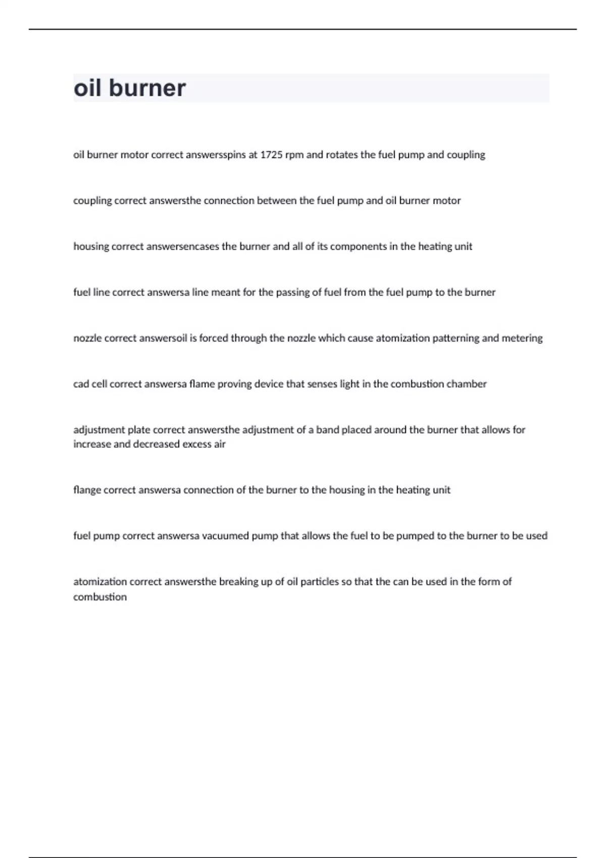 oil burner motor correct answersspins at 1725 rpm and rotates the fuel pump and coupling coupling correct answersthe connection between the fuel pump and oil burner motor housing correct answersencases the burner and all of its components in the heating unit fuel line correct answersa line meant for the passing of fuel from the fuel pump to the burner nozzle correct answersoil is forced through the nozzle which cause atomization patterning and metering