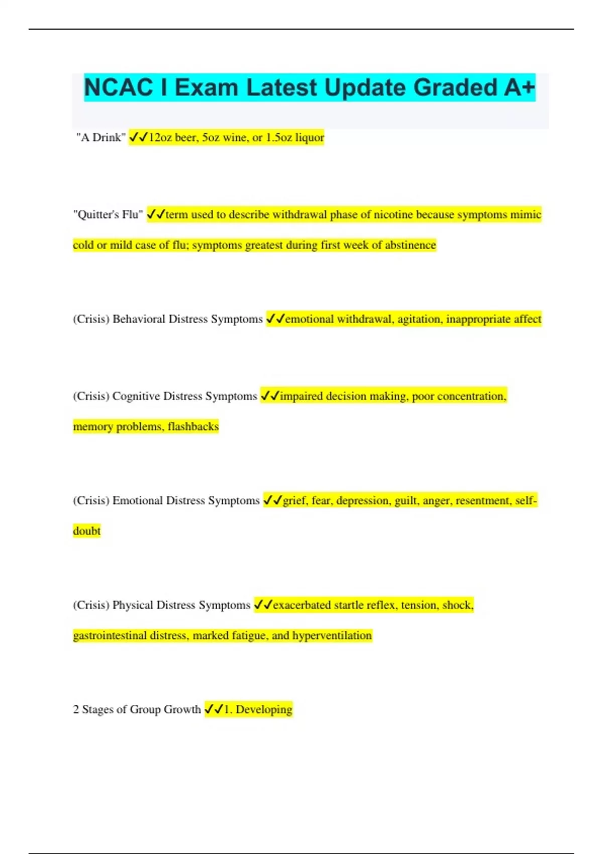 NCAC I Exam Latest Update Graded A+ "A Drink" 12oz beer, 5oz wine, or 1.5oz liquor "Quitter's Flu" term used to describe withdrawal phase of nicotine because symptoms mimic cold or mild case of flu; symptoms greatest during first week of abstinence (Crisis) Behavioral Distress Symptoms emotional withdrawal, agitation, inappropriate affect (Crisis) Cognitive Distress Symptoms impaired decision making, poor concentration, memory problems, flashbacks (Crisis) Emotional Distress Symptoms grief, fear, depression, guilt, anger, resentment, self- doubt (Crisis) Physical Distress Symptoms exacerbated startle reflex, tension, shock, gastrointestinal distress, marked fatigue, and hyperventilation 2 Stages of Group Growth 1. Developing 2. Potency 3 Processes of Groups 1.) Compliance 2.) Identification 3.) Internalization 4 Categories of Inhalants 1. volatile solvents 2. aerosols 3. gases 4. nitrates 4 Categories of Medication Therapy 1. Agonists 2. Antagonists 3. Antidepressants 4. Antipsychotics 4 Components of Suicide Assessment 1. Behavioral indications 2. Historical patterns 3. Present situation 4. Degree of lethality 4 factors of pharmacokinetics 1. absorption 2. distribution 3. biotransformation 4. excretion 4 Models of Case Management 1. Broker/Generalist 2. Strengths Based