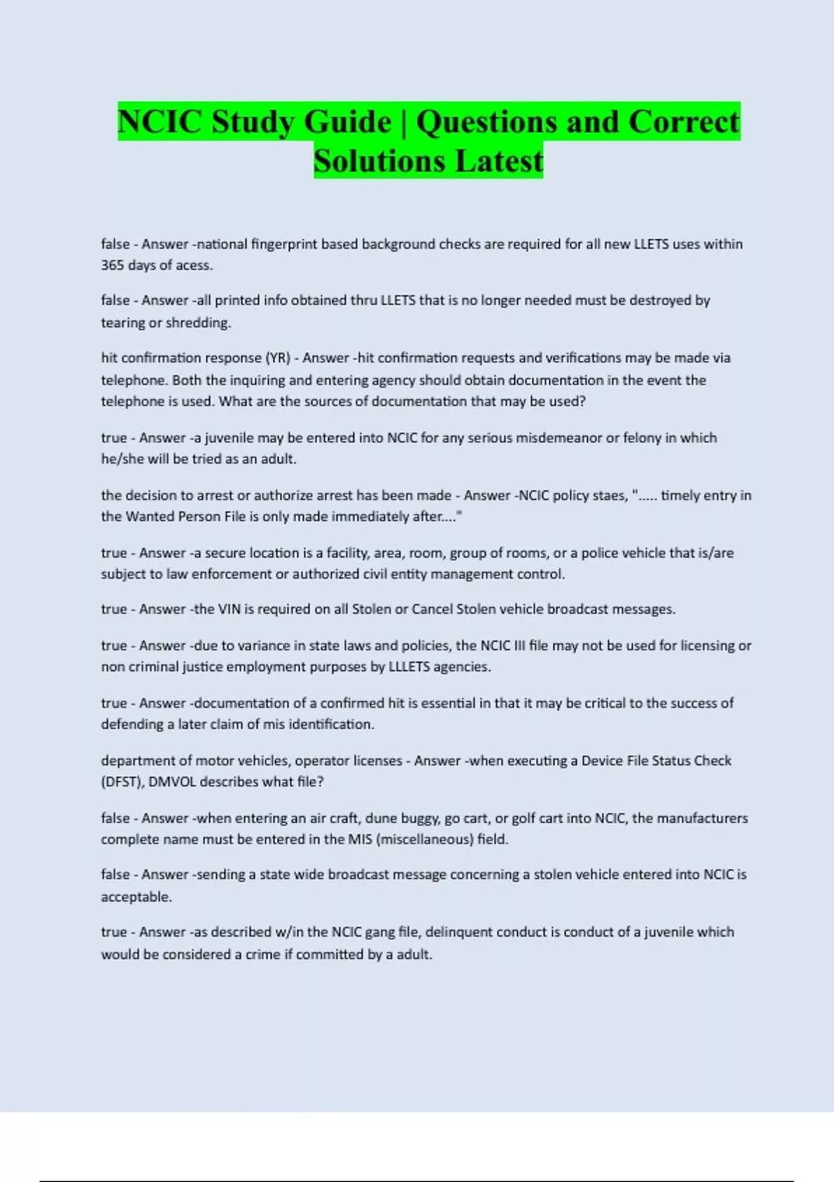 NCIC Study Guide | Questions and Correct Solutions Latest false - Answer -national fingerprint based background checks are required for all new LLETS uses within 365 days of acess. false - Answer -all printed info obtained thru LLETS that is no longer needed must be destroyed by tearing or shredding. hit confirmation response (YR) - Answer -hit confirmation requests and verifications may be made via telephone. Both the inquiring and entering agency should obtain documentation in the event the telephone is used. What are the sources of documentation that may be used? true - Answer -a juvenile may be entered into NCIC for any serious misdemeanor or felony in which he/she will be tried as an adult. the decision to arrest or authorize arrest has been made - Answer -NCIC policy staes, "..... timely entry in the Wanted Person File is only made immediately after...." true - Answer -a secure location is a facility, area, room, group of rooms, or a police vehicle that is/are subject to law enforcement or authorized civil entity management control. true - Answer -the VIN is required on all Stolen or Cancel Stolen vehicle broadcast messages. true - Answer -due to variance in state laws and policies, the NCIC III file may not be used for licensing or non criminal justice employment purposes by LLLETS agencies. true - Answer -documentation of a confirmed hit is essential in that it may be critical to the success of defending a later claim of mis identification. department of motor vehicles, operator licenses - An