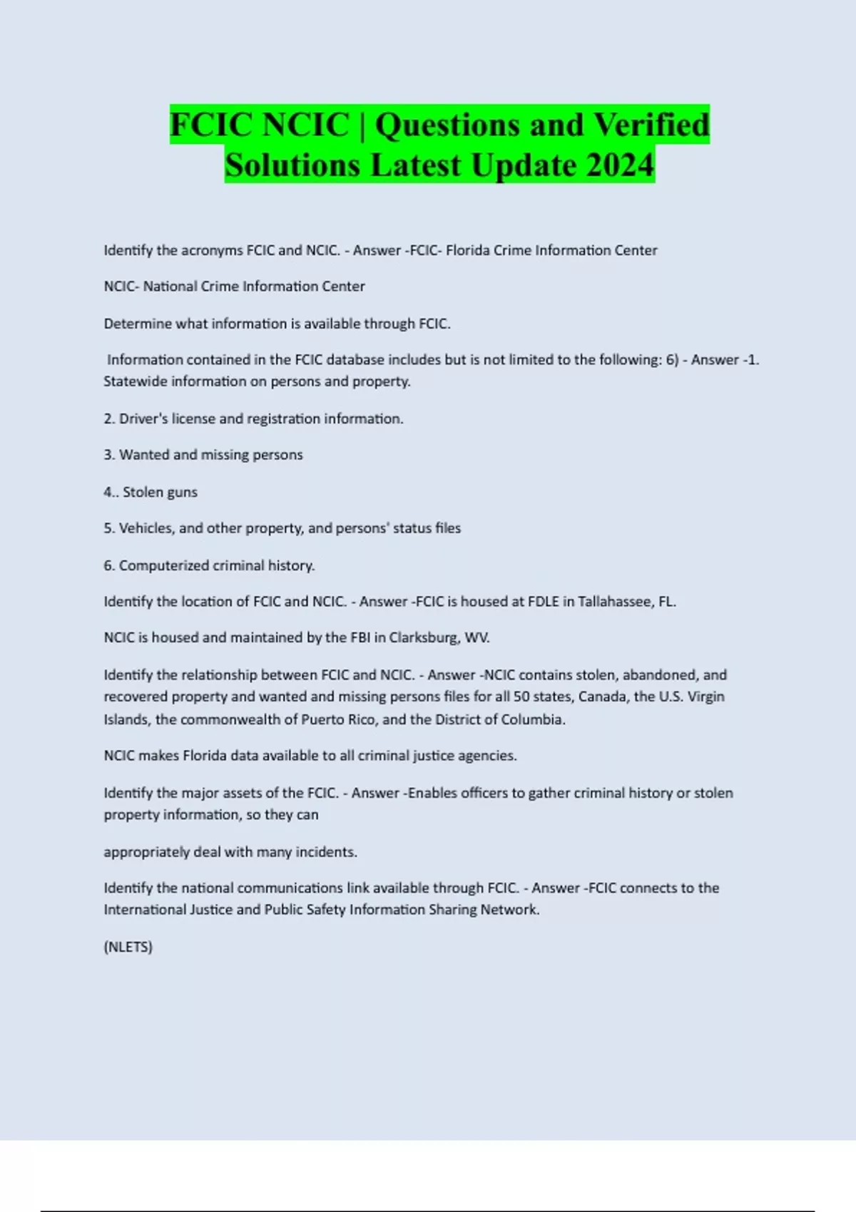 FCIC NCIC | Questions and Verified Solutions Latest Update 2024