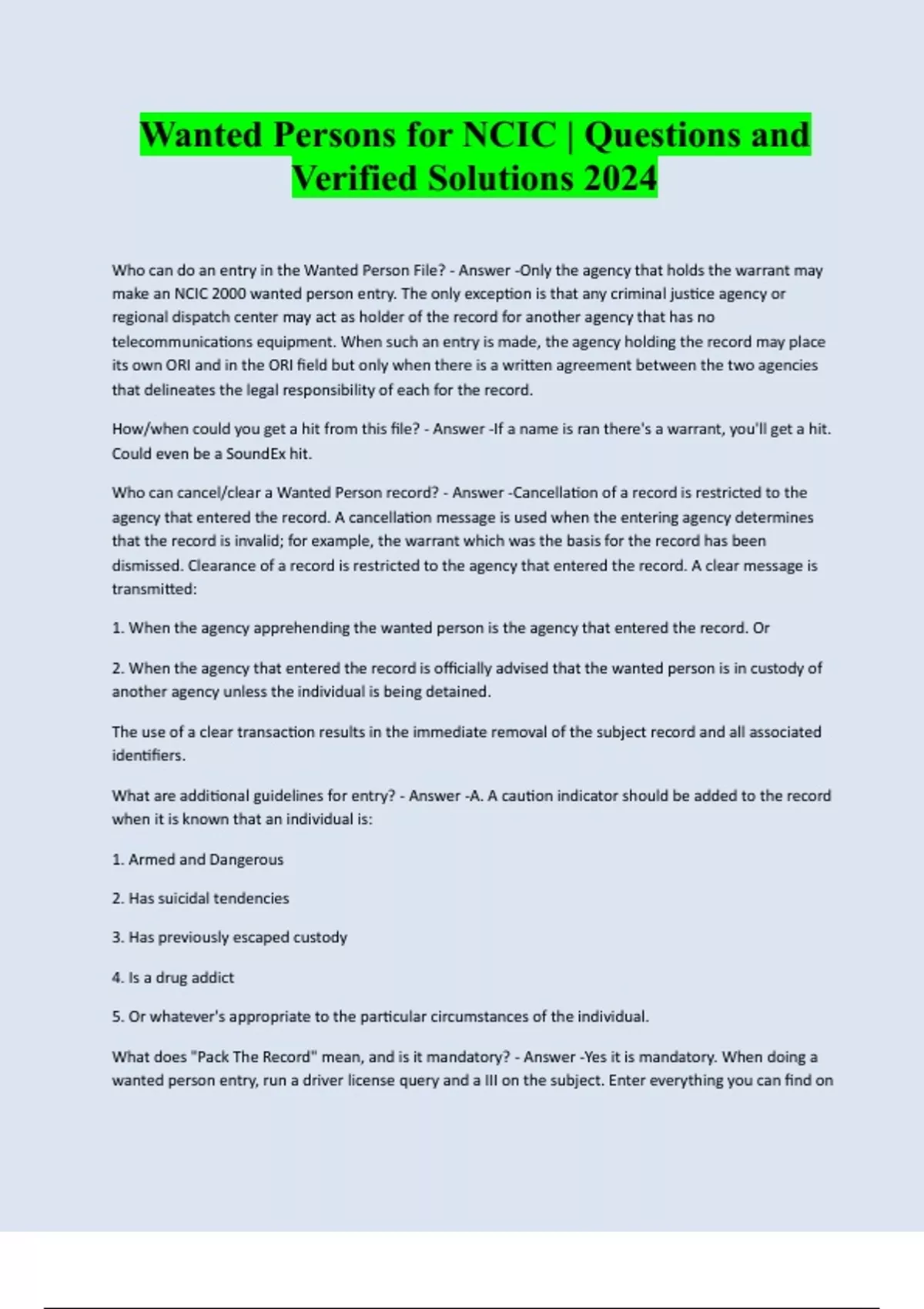 Wanted Persons for NCIC | Questions and Verified Solutions 2024