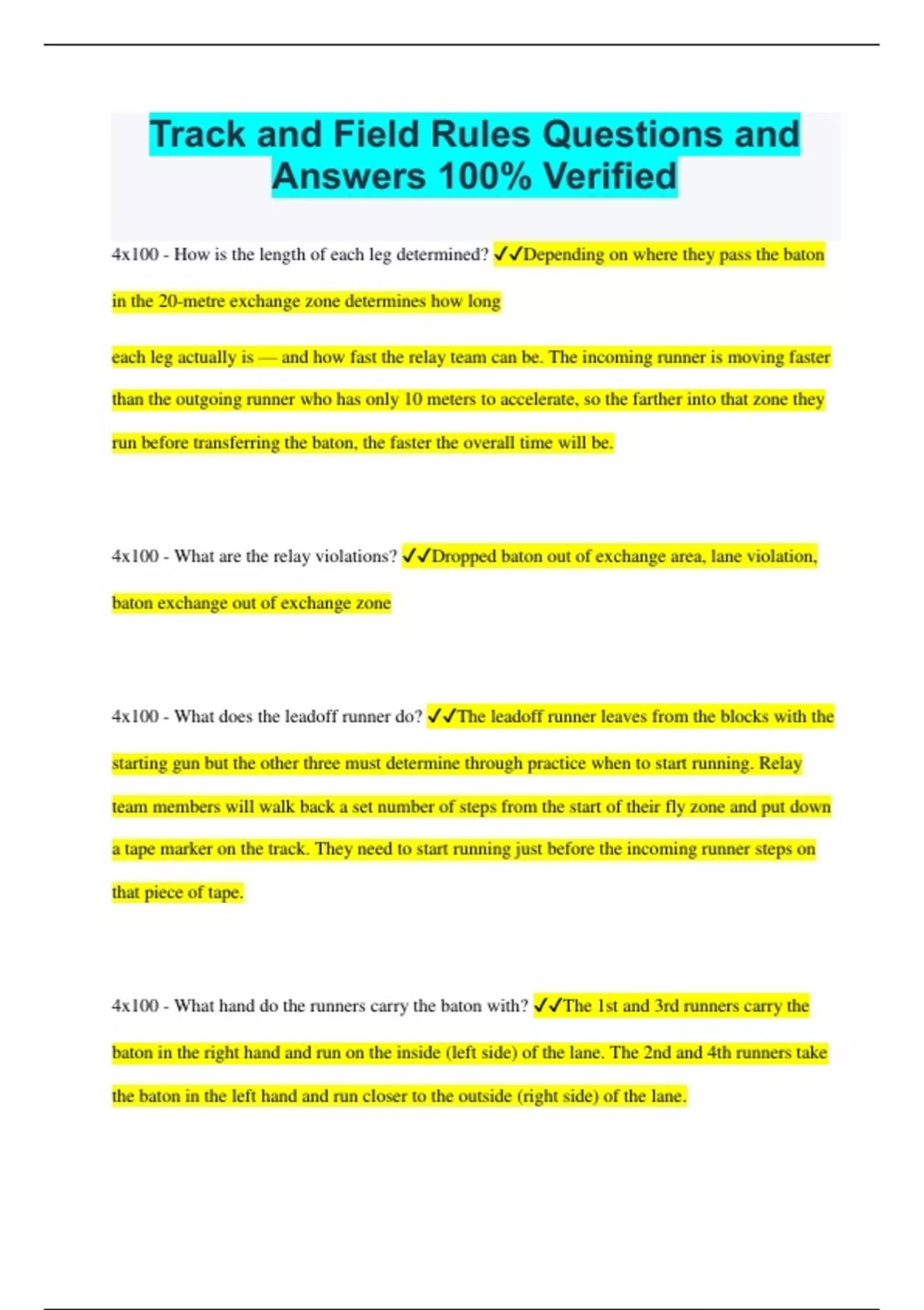 Track and Field Rules Questions and Answers 100% Verified 4x100 - How is the length of each leg determined? Depending on where they pass the baton in the 20-metre exchange zone determines how long each leg actually is — and how fast the relay team can be. The incoming runner is moving faster than the outgoing runner who has only 10 meters to accelerate, so the farther into that zone they run before transferring the baton, the faster the overall time will be. 4x100 - What are the relay violations? Dropped baton out of exchange area, lane violation, baton exchange out of exchange zone 4x100 - What does the leadoff runner do? The leadoff runner leaves from the blocks with the starting gun but the other three must determine through practice when to start running. Relay team members will walk back a set number of steps from the start of their fly zone and put down a tape marker on the track. They need to start running just before the incoming runner steps on that piece of tape. 4x100 - What hand do the runners carry the baton with? The 1st and 3rd runners carry the baton in the right hand and run on the inside (left side) of the lane. The 2nd and 4th runners take the baton in the left hand and run closer to the outside (right side) of the lane. 4x100 - What is the 10-metre fly zone in 4x100 race? where the outgoing runner gets up to speed before entering the 20-metre exchange zone where the baton must be passed between team members. 4x100 - who is the first leg? the team's strong starter, someone who can really explode out of the blocks but is steady enough not to risk a false start, and can run a good first corner. 4x100 - who is the fourth leg? often the team's fastest runner, one who possesses a highly competitive nature and can hold off challengers or chase down competitors if the team is behind. It also needs to be someone who can stay focused in that final high traffic exchange zone where tension is at its peak 4x100 - who is the second leg? often one of the longest legs and it demands great speed endurance. It usually goes to a strong 200-metre runner and, since they receive and pass the baton with their left hand, they must also be very good at handling the stick. 4x100 - who is the third leg? a curve specialist who can receive and deliver the baton on a turn and has the ability to run a fast curve close to the inside lane line without stepping