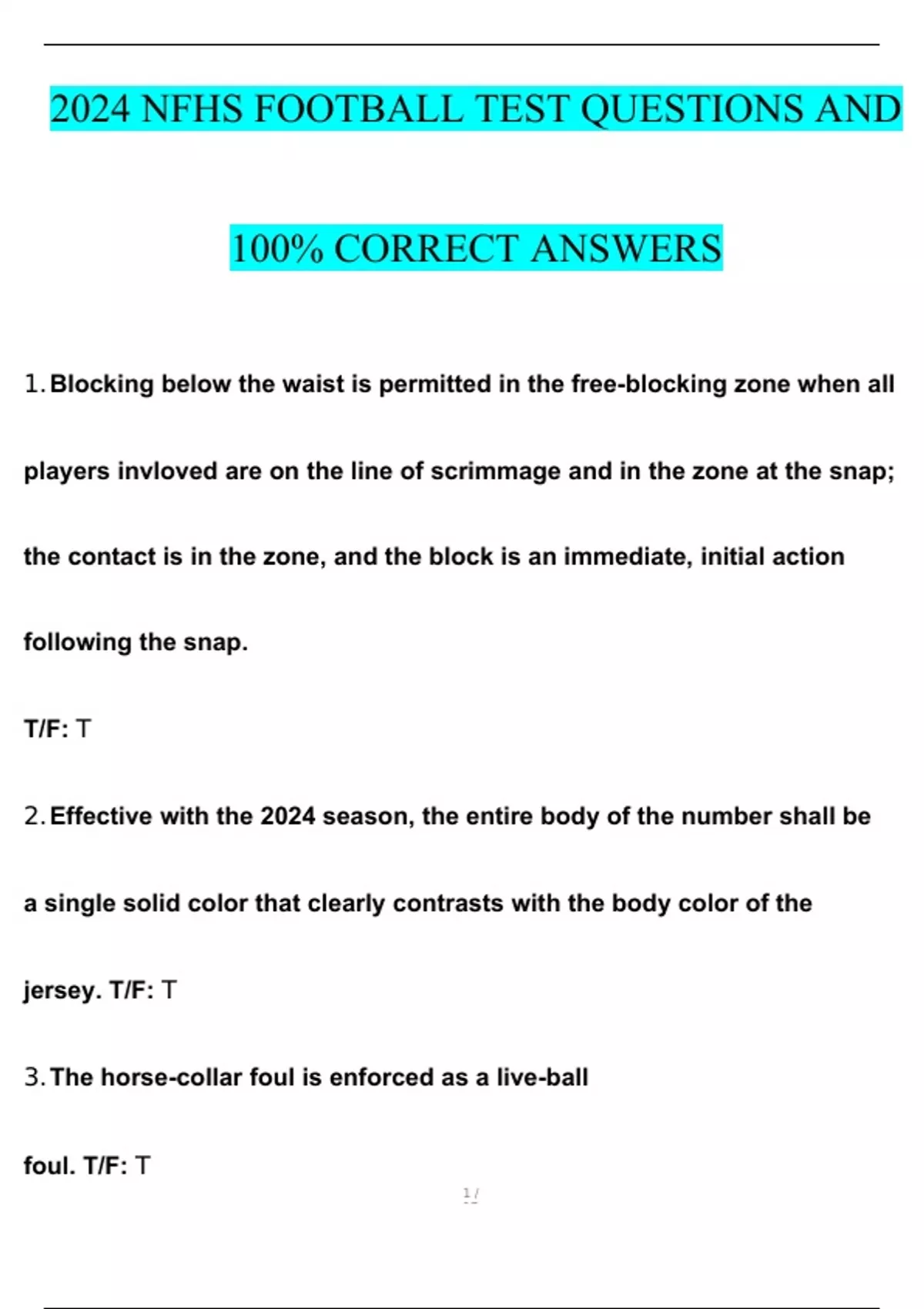 NFHS FOOTBALL TEST EXAM 2024 WITH 100% CORRECT ANSWERS