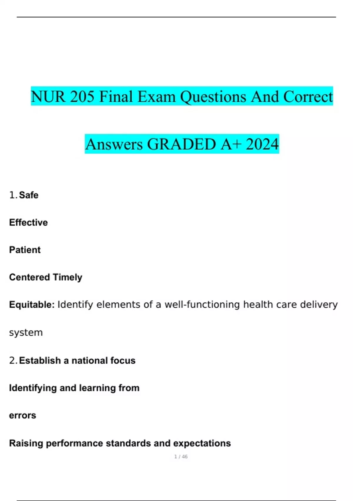 NUR 205 Final Exam Questions With Verified Solutions
