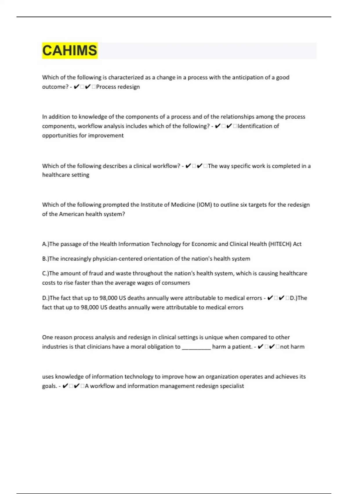 Which of the following is characterized as a change in a process with the anticipation of a good outcome? - ️️Process redesign In addition to knowledge of the components of a process and of the relationships among the process components, workflow analysis includes which of the following? - ️️Identification of opportunities for improvement Which of the following describes a clinical workflow? - ️️The way specific work is completed in a healthcare setting Which of the following prompted the Institute of Medicine (IOM) to outline six targets for the redesign of the American health system? A.)The passage of the Health Information Technology for Economic and Clinical Health (HITECH) Act B.)The increasingly physician-centered orientation of the nation's health system C.)The amount of fraud and waste throughout the nation's health system, which is causing healthcare costs to rise faster than the average wages of consumers D.)The fact that up to 98,000 US deaths annually were attributable to medical errors - ️️D.)The fact that up to 98,000 US deaths annually were attributable to medical errors One reason process analysis and redesign in clinical settings is unique when compared to other industries is that clinicians have a moral obligation to _________ harm a patient. - ️️not harm uses knowledge of information technology to improve how an organization operates and achieves its goals. - ️️A workflow and information management redesign specialist