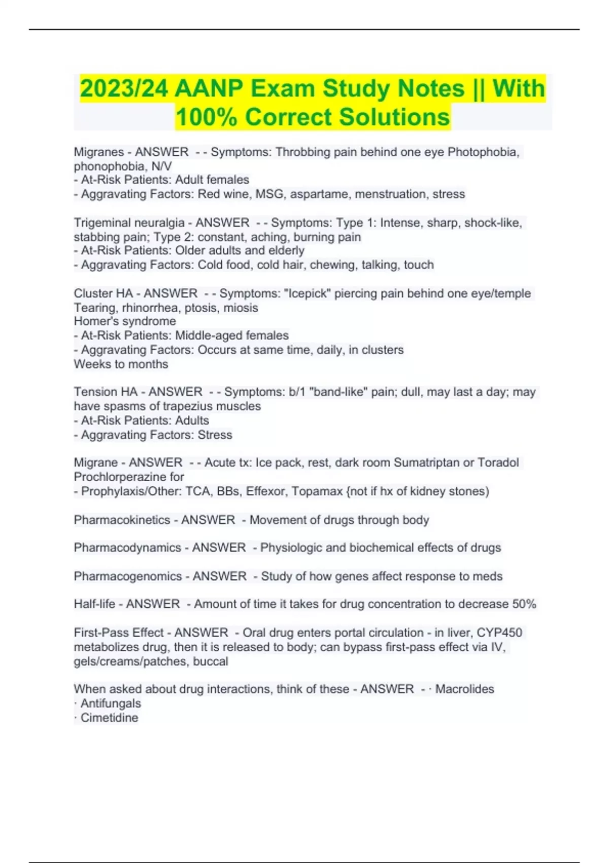 2023/24 AANP Exam Study Notes || With 100% Correct Solutions 2023/24 AANP Exam Study Notes || With 100% Correct Solutions Migranes - ANSWER - - Symptoms: Throbbing pain behind one eye Photophobia, phonophobia, N/V - At-Risk Patients: Adult females - Aggravating Factors: Red wine, MSG, aspartame, menstruation, stress Trigeminal neuralgia - ANSWER - - Symptoms: Type 1: Intense, sharp, shock-like, stabbing pain; Type 2: constant, aching, burning pain - At-Risk Patients: Older adults and elderly - Aggravating Factors: Cold food, cold hair, chewing, talking, touch Cluster HA - ANSWER - - Symptoms: "Icepick" piercing pain behind one eye/temple Tearing, rhinorrhea, ptosis, miosis Homer's syndrome - At-Risk Patients: Middle-aged females - Aggravating Factors: Occurs at same time, daily, in clusters Weeks to months Tension HA - ANSWER - - Symptoms: b/1 "band-like" pain; dull, may last a day; may have spasms of trapezius muscles - At-Risk Patients: Adults - Aggravating Factors: Stress Migrane - ANSWER - - Acute tx: Ice pack, rest, dark room Sumatriptan or Toradol Prochlorperazine for - Prophylaxis/Other: TCA, BBs, Effexor, Topamax {not if hx of kidney stones) Pharmacokinetics - ANSWER - Movement of drugs through body Pharmacodynamics - ANSWER - Physiologic and biochemical effects of drugs Pharmacogenomics - ANSWER - Study of how genes affect response to meds Half-life - ANSWER - Amount of time it takes for drug concentration to decrease 50% First-Pass Effect - ANSWER - Oral drug enters portal circulation - in liver, CYP450 metabolizes drug, then it is released to body; can bypass first-pass effect via IV, gels/creams/patches, buccal When asked about drug interactions, think of these - ANSWER - · Macrolides · Antifungals · Cimetidine · Citalopram · Protease inhibitors · Grapefruit juice (Interacts with statins, erythromycin, CCBs, antivirals, amiodarone, benzos, cisapride, carbamazepine, buspirone) Safety Issues with Common Meds Drug: Thiazolidinediones e.g. pioglitazone