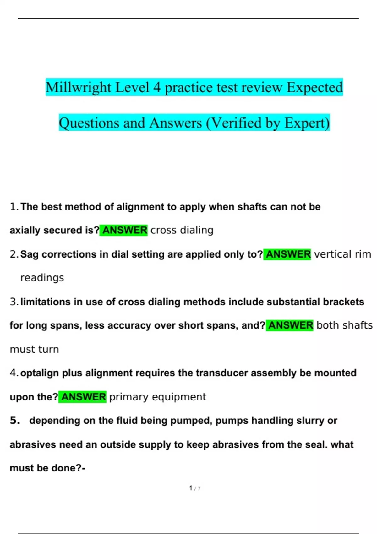 Millwright Level 4 Exam 2024 Expected Questions and Answers (Verified by Expert) Millwright Level 4 Exam 2024 Expected Questions and Answers (Verified by Expert) Millwright Level 4 Exam 2024 Expected Questions and Answers (Verified by Expert) Millwright Level 4 practice test review Expected Questions and Answers (Verified by Expert) 1. The best method of alignment to apply when shafts can not be axially secured is? ANSWER cross dialing 2. Sag corrections in dial setting are applied only to? ANSWER vertical rim readings 3. limitations in use of cross dialing methods include substantial brackets for long spans, less accuracy over short spans, and? ANSWER both shafts must turn 4. optalign plus alignment requires the transducer assembly be mounted upon the? ANSWER primary equipment 5. depending on the fluid being pumped, pumps handling slurry or abrasives need an outside supply to keep abrasives from the seal. what must be done?- ANSWER the outside supply should be at least 10 psi over pump pressure 6. why is the crankcase ventilation system in an air compressor important? ANSWER - maintains atmospheric pressure 7. the two main classes of compressors are? ANSWER positive displacement and dynamic 8. if the capacity of the reciprocating compressor has to be changed, it is done best by? ANSWER adjusting the clearance pocket valve 9. The purpose of camber in a chain conveyor is to? ANSWER hold chain against conveyor bottom 10. chain blocks are designed so that the top hook is? ANSWER stronger than the lower hook 11. The foundation of a machine subject to critical alignment is poured with the concrete level at a minus elevation of? ANSWER 3/4" - 1 1/2" 12. a cyclone on a pneumatic conveyor is a? ANSWER separator 13. shock load on a bearing will result in the bearing becoming? ANSWER brinelled 14. finished grout should be kept wet for how long? ANSWER 24 hours 15. the amount of taper on a NPT thread is? ANSWER 3/4" per foot 16. A governor is a device that will control of a prime mover under varying conditions of load. ANSWER speed 17. the number of teeth per inch of a hacksaw blade for general work is? ANSWER 18 teeth 18. the Vee head of a combination set is frequently used to? ANSWER lay out center lines on the end of round stock