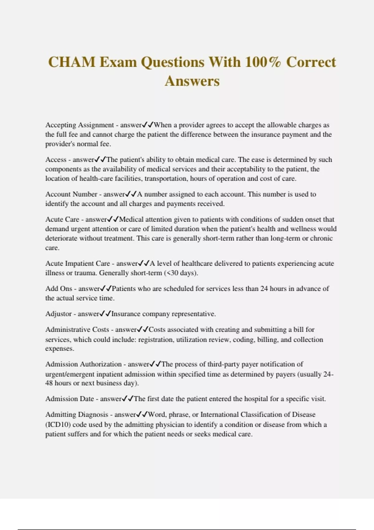 CHAM Exam Questions With 100% Correct Answers Accepting Assignment - answerWhen a provider agrees to accept the allowable charges as the full fee and cannot charge the patient the difference between the insurance payment and the provider's normal fee. Access - answerThe patient's ability to obtain medical care. The ease is determined by such components as the availability of medical services and their acceptability to the patient, the location of health-care facilities, transportation, hours of operation and cost of care. Account Number - answerA number assigned to each account. This number is used to identify the account and all charges and payments received. Acute Care - answerMedical attention given to patients with conditions of sudden onset that demand urgent attention or care of limited duration when the patient's health and wellness would deteriorate without treatment. This care is generally short-term rather than long-term or chronic care. Acute Impatient Care - answerA level of healthcare delivered to patients experiencing acute illness or trauma. Generally short-term (<30 days). Add Ons - answerPatients who are scheduled for services less than 24 hours in advance of the actual service time. Adjustor - answerInsurance company representative. Administrative Costs - answerCosts associated with creating and submitting a bill for services, which could include: registration, utilization review, coding, billing, and collection expenses. Admission Authorization - answerThe process of third-party payer notification of urgent/emergent inpatient admission within specified time as determined by payers (usually 24- 48 hours or next business day). Admission Date - answerThe first date the patient entered the hospital for a specific visit. Admitting Diagnosis - answerWord, phrase, or International Classification of Disease (ICD10) code used by the admitting physician to identify a condition or disease from which a patient suffers and for which the patient needs or seeks medical care. Admitting Physician - answerThe physician who writes the order for the patient to be admitted to the hospital. The physician must have admitting privileges at the facility providing the healthcare services. Advance Beneficiary Notice - answerA notice that a care provider should give a Medicare beneficiary to sign if the services being provided may not be considered medically necessary and Medicare may not pay for them. Allows the beneficiary to make an informed decision prior to services regarding whether or not they wish to receive services. Are not routinely given to emergency department patients. Advance Directive - answerA written instruction relating to the provision of healthcare when a patient is incapacitated. It could include appointing someone to make medical decisions, a statement expressing the patient's wishes about anatomical gifts (i.e. organ donation) and general statements about whether or not life sustaining treatments should be withheld or withdrawn. Adverse Selection - answerAmong applicants for a given group or individual program, the tendency for those with an impaired health status, or who are prone to higher than average utilization of benefits to be enrolled in disproportionate number and lower deductibles. Alias - answerA name by which the patient is also "known as", or formerly known as. All Patient Diagnosis Related Groups Assignment of Benefits (APDRG) - answerA prospective hospital claims reimbursement system currently utilized by the federal government Medicaid program and the states of New York and New Jersey. Designed to describe the complete cross section of patients seen in acute care hospitals. Approximately 639 are defined according to the principal diagnosis, secondary diagnoses, procedures, age, birth weight, sex and discharge status. Each category has an established fixed reimbursement rate based on average cost of treatment within a geographic area. Were developed to quantify the difference in demographic groups and clinical risk factors for patients treated in hospitals. This proprietary grouping system's (i.e. 3M) purpose is to obtain fair and accurate statistical comparisons between disparate populations and groups. Unlike the Diagnosis Related Group (DRG) reimbursement system, which is intended to capture resource utilization intensity, this system captures and relates the severity of illness and risk of mortality factors present as a result of a patient's disease and disorders and the interaction of those disorders. A form is signed by the patient giving the healthcare provider authority to bill his/her insurance plan and receive payment. The form is generally presented and signed at the time of registration. Alphanumeric - answerLetters, numbers, punctuation marks and mathematical symbols, as opposed to "numeric" which is numbers only. Term typically related to the kind of data accepted in a computer field or in coding. Ambulatory Care Patient - answerPatient receives medical or surgical care in an outpatient setting that involves a broader, less specialized range of care. Ambulatory patients are generally able to walk and are not confined to a bed. In a hospital setting, ambulatory care generally refers to healthcare services provided on an outpatient basis.