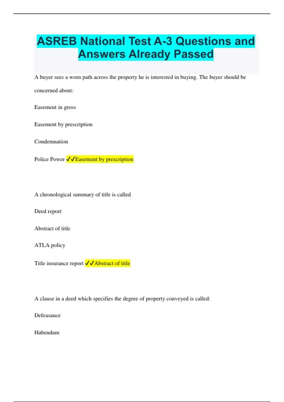 ASREB National Test A-3 Questions and Answers Already Passed A buyer sees a worn path across the property he is interested in buying. The buyer should be concerned about: Easement in gross Easement by prescription Condemnation Police Power Easement by prescription A chronological summary of title is called Deed report Abstract of title ATLA policy Title insurance report Abstract of title A clause in a deed which specifies the degree of property conveyed is called: Defeasance Habendum Acknowledgment Consideration clause Habendum A covenant against encumbrances insures against all of the following EXCEPT: Zoning to restrict the use of property Loans on the property Encumbrances and encroachments Recorded easements Zoning to restrict the use of property A deed does not guarantee against which of the following? Quiet enjoyment Zoning laws Liens and encumbrances Property description Zoning laws A deed is in escrow and signed by the grantor who dies before the close of escrow. What is the status of the deed? Void Unenforceable Valid Intestate Valid A demising clause would be found in which document Will Mortgage Deed Lease Lease A gift deed would best be described as: Like for like kind