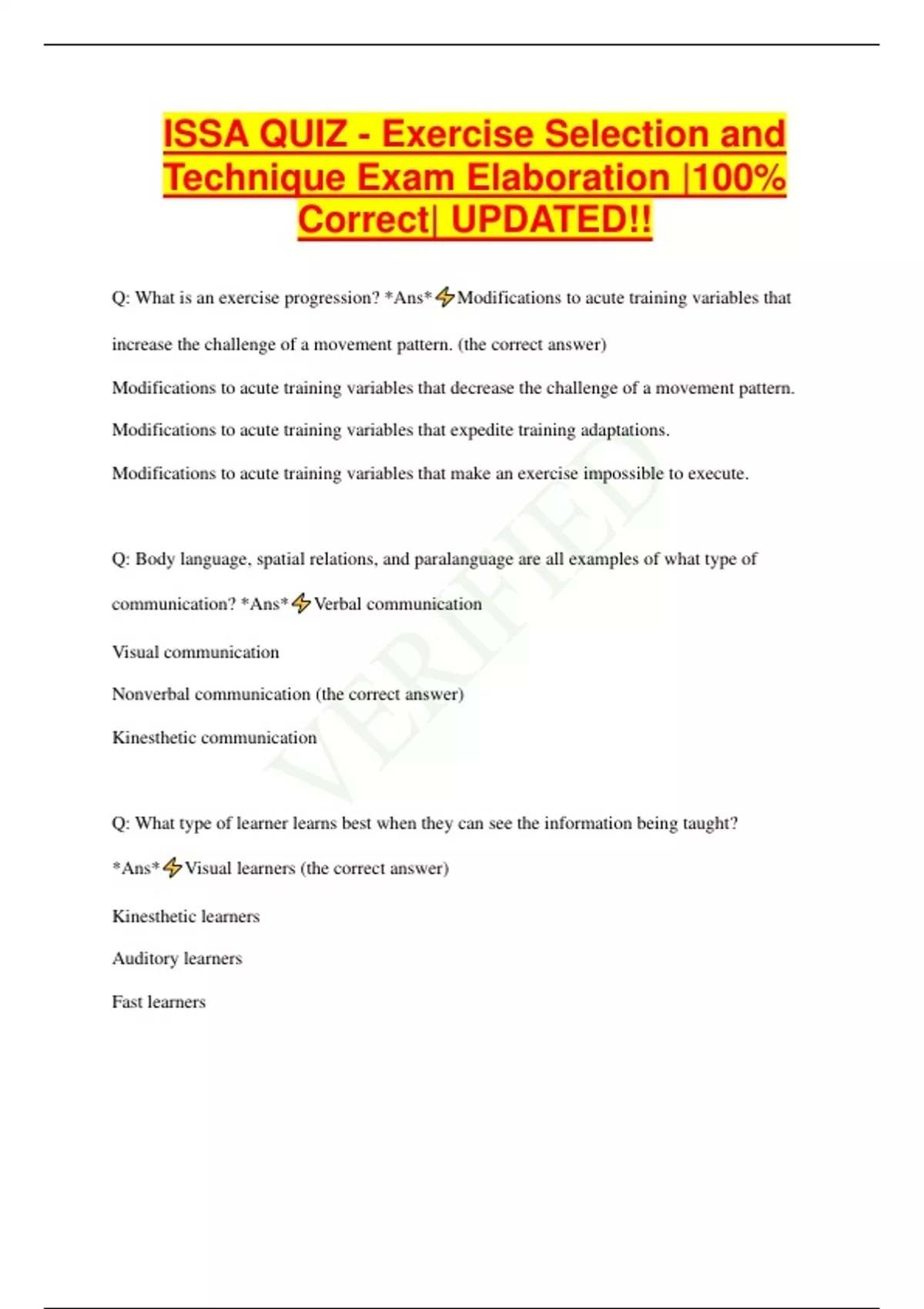 ISSA QUIZ - Exercise Selection and Technique Exam Elaboration |100% Correct| UPDATED!! Q: What is an exercise progression? *Ans* Modifications to acute training variables that increase the challenge of a movement pattern. (the correct answer) Modifications to acute training variables that decrease the challenge of a movement pattern. Modifications to acute training variables that expedite training adaptations. Modifications to acute training variables that make an exercise impossible to execute. Q: Body language, spatial relations, and paralanguage are all examples of what type of communication? *Ans* Verbal communication Visual communication Nonverbal communication (the correct answer) Kinesthetic communication Q: What type of learner learns best when they can see the information being taught? *Ans* Visual learners (the correct answer) Kinesthetic learners Auditory learners Fast learner