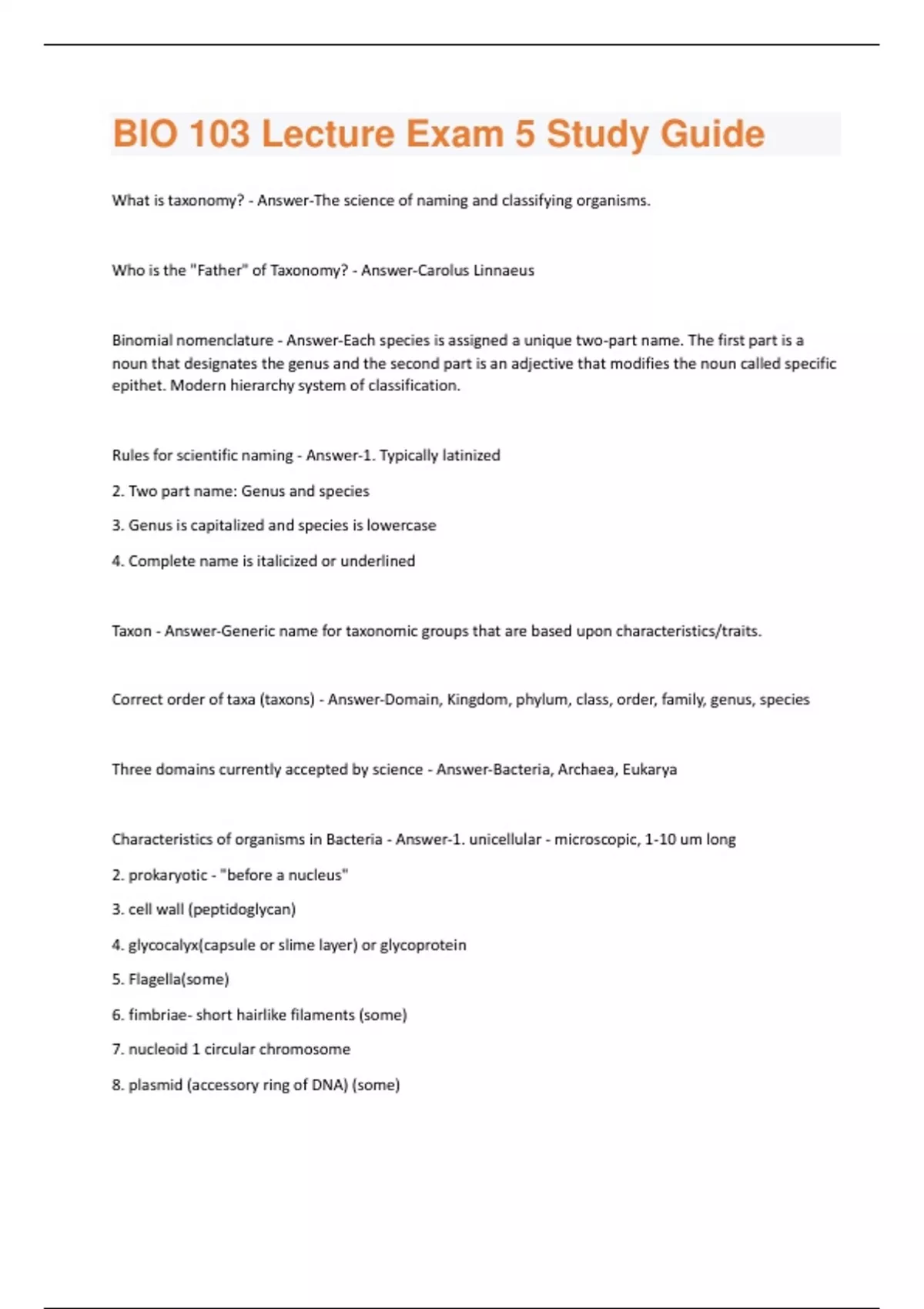 What is taxonomy? - Answer-The science of naming and classifying organisms. Who is the "Father" of Taxonomy? - Answer-Carolus Linnaeus Binomial nomenclature - Answer-Each species is assigned a unique two-part name. The first part is a noun that designates the genus and the second part is an adjective that modifies the noun called specific epithet. Modern hierarchy system of classification. Rules for scientific naming - Answer-1. Typically latinized 2. Two part name: Genus and species 3. Genus is capitalized and species is lowercase 4. Complete name is italicized or underlined Taxon - Answer-Generic name for taxonomic groups that are based upon characteristics/traits. Correct order of taxa (taxons) - Answer-Domain, Kingdom, phylum, class, order, family, genus, species Three domains currently accepted by science - Answer-Bacteria, Archaea, Eukarya Characteristics of organisms in Bacteria - Answer-1. unicellular - microscopic, 1-10 um long 2. prokaryotic - "before a nucleus" 3. cell wall (peptidoglycan) 4. glycocalyx(capsule or slime layer) or glycoprotein 5. Flagella(some) 6. fimbriae- short hairlike filaments (some) 7. nucleoid 1 circular chromosome 8. plasmid (accessory ring of DNA) (some)9. ribosomes....fewer & smaller 10. thylakoids(some) 11. Heterotrophic Characteristics of organisms in Archaea - Answer-1. Prokaryotes 2. Unicellular 3. microscopic 4. Peptidoglycan absent in cell walls Characteristics of organisms in Eukarya - Answer-1. No peptidoglycan 2.Has nucleus and organelles 3.Cell wall (ether lipids) How many kingdoms are in domain Eukarya - Answer-4; Protists, Plantae, Fungi, Animalia Why was Kingdom Monera divided into Domains Bacteria and Archaea? - Answer-There was a lot of them so they got moved into a biggr category. Characteristics of kingdom fungi - Answer-1. Eukaryotic 2. Most Fungi are multicellular 3. Heterotroph by absorbtion 4. Chitin Cell Walls- Composed of mainly nitrogen 5. No motile stage 6.Adult form is haploid, zygote is diploid, the zygote splits into haploid spores 7. Asexual 8. Hyphae- Tiny filaments composed of tubular cell walls filled with protoplasm 9. Mycelium- A mass of intertwined hyphae 10. Septate- Walls that divide the hyphae into individual cells 11. Has no septate What is the most inclusive category of classification? - Answer-DomainThree domains of organisms - Answer-Eukarya, Archaea, Bacteria Which characteristics divide Bacteria from Archaea? - Answer-rRNA base sequence, plasma membrane, & cell wall chemistry. Are Bacteria & Archaea prokaryotic or eukaryotic? - Answer-Prokaryotic What is the primary characteristic of Eukarya? - Answer-unicellular & multicellular organisms. Membrane bound nucleus. How many kingdoms are in domain Eukarya? - Answer-4; Kingdom Protista, Fungi, Plantae, Animalia What are the major characteristics for Kingdoms Protista, Fungi, Plantae, & Animalia? - Answer-Protista: Domain: Eukarya Kingdom: Protista Cell Type: Eukaryote Cell Structures: Cell walls of CELLULOSE: some have chloroplasts Number of Cells: Most unicellular, some colonial or multicellular Mode of Nutrition: Autotroph or heterotroph Example: AMOEBA, PARAMECIUM, MOLDS, GIANT KELP Fungi: Domain: Eukarya Kingdom: Fungi Cell Type: Eukaryote Cell Structures: Cell walls of CHITIN Number of Cells: some unicellular,,MOST MULTICELLULAR Mode of Nutrition: HeterotrophExample: MUSHROOMS AND YEAST Plantae: Domain: Eukaryote Kingdom: Plantae Cell Type: Eukaryote Cell Structures: Cell walls with CELLULOSE; chloroplasts Number of Cells: MULTICELLULAR Mode of Nutrition: Autotroph Example: Moss, ferns, and flowering plants Animals: Domain: Eukaryotes Kingdom: Animalia Cell Type: Eukaryotes Cell Structures: NO Cell walls and NO CHLOROPLASTS Number of Cells: Multicellular Mode of Nutrition: Heterotroph Example: Sponges, worms, insects, fishes, mammals