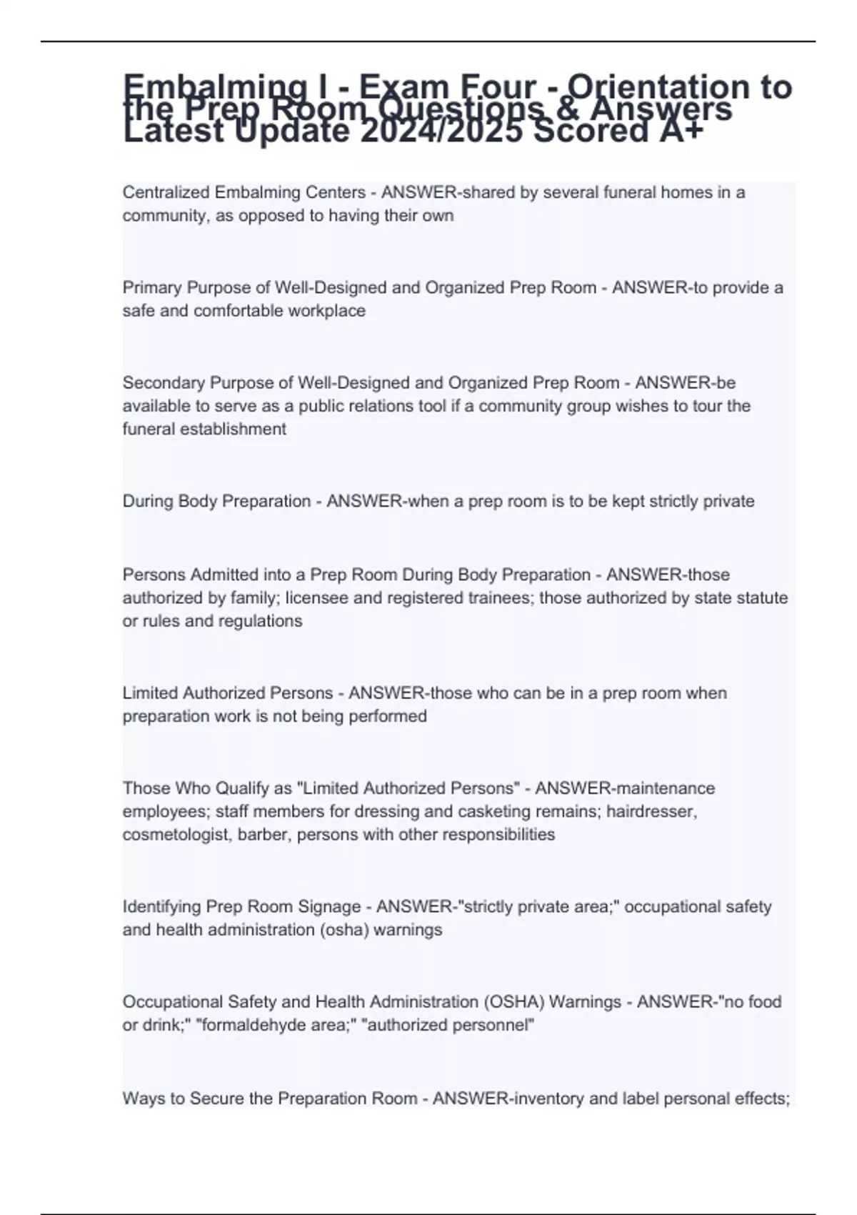 Embalming I - Exam Four - Orientation to the Prep Room Questions & Answers Latest Update 2024/2025 Scored A+