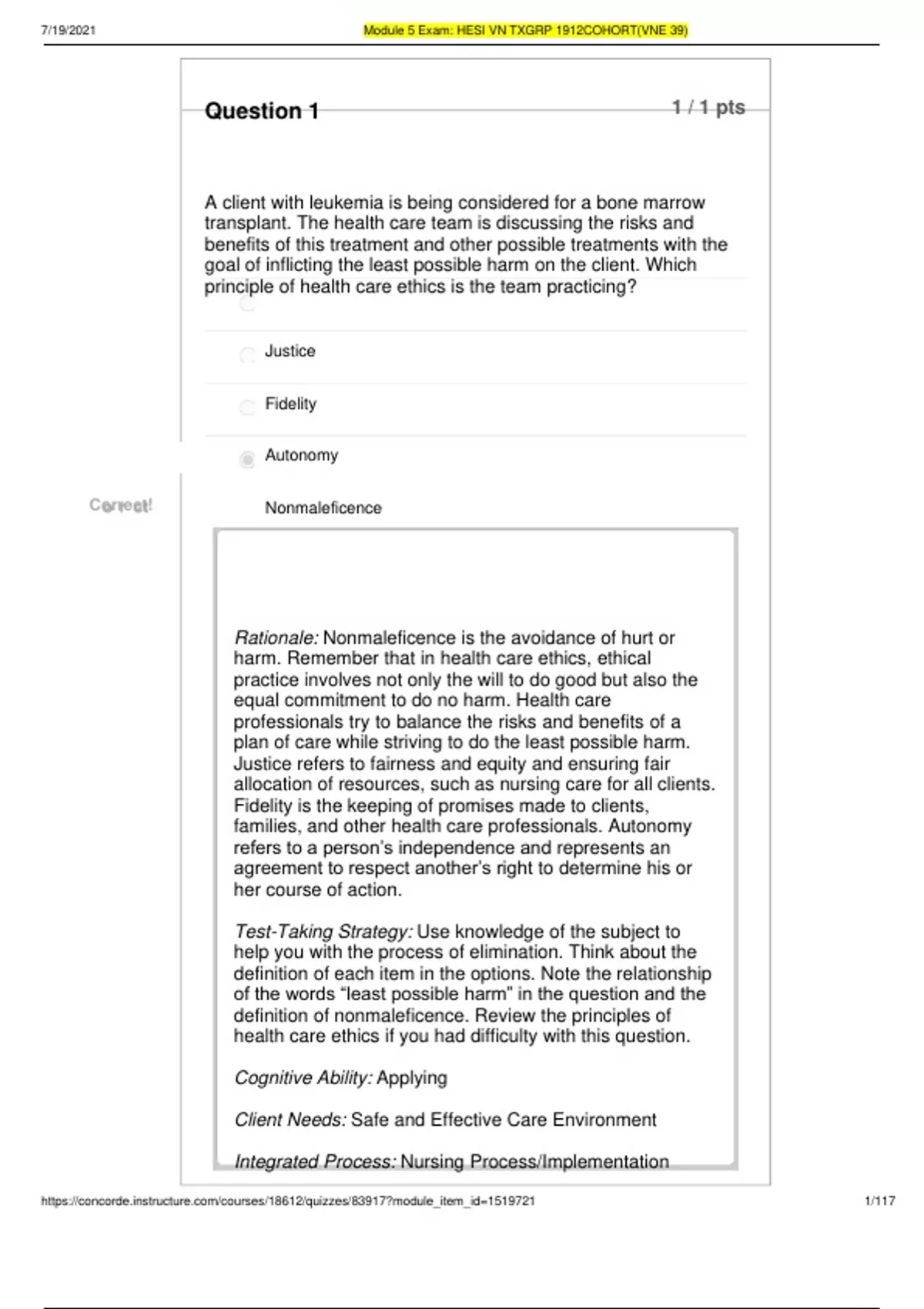 Question 1 1 / 1 pts A client with leukemia is being considered for a bone marrow transplant. The health care team is discussing the risks and benefits of this treatment and other possible treatments with the goal of inflicting the least possible harm on the client. Which principle of health care ethics is the team practicing? Justice Fidelity Autonomy Correct! Nonmaleficence Rationale: Nonmaleficence is the avoidance of hurt or harm. Remember that in health care ethics, ethical practice involves not only the will to do good but also the equal commitment to do no harm. Health care professionals try to balance the risks and benefits of a plan of care while striving to do the least possible harm. Justice refers to fairness and equity and ensuring fair allocation of resources, such as nursing care for all clients. Fidelity is the keeping of promises made to clients, families, and other health care professionals. Autonomy refers to a person’s independence and represents an agreement to respect another’s right to determine his or her course of action. Test-Taking Strategy: Use knowledge of the subject to help you with the process of elimination. Think about the definition of each item in the options. Note the relationship of the words “least possible harm” in the question and the definition of nonmaleficence. Review the principles of health care ethics if you had difficulty with this question. Cognitive Ability: Applying Client Needs: Safe and Effective Care Environment Integrated Process: Nursing Process/Implementation Content Area: Ethical/Legal Question 2 1 / 1 pts Which action by the nurse represents the ethical principle of beneficence? The nurse upholds a client’s decision to refuse chemotherapy for lung cancer. The nurse follows a plan of care designed to relieve pain in a client with cancer. Correct! The nurse administers an immunization to a child even though it may cause discomfort. The nurse provides equal amounts of care to all assigned clients on the basis of illness acuity. Rationale: Beneficence is taking action to help others. Although administration of a child’s immunization might cause discomfort, the benefits of protection from disease outweigh the temporary discomfort. Fidelity is keeping promises made to clients, families, and other health care professionals. Autonomy is a person’s independence. Respecting another’s autonomy means that you are agreeing to respect that person’s right to determine his or her course of action. Justice refers to fairness and equity, including fair allocation of resources, such as nursing care for all clients. Test-Taking Strategy: Focus on the subject, beneficence. Recalling that beneficence refers to taking action to help others will direct you to the correct option. Review the principles of health care ethics if you had difficulty with this question. Cognitive Ability: Applying Client Needs: Safe and Effective Care Environment Integrated Process: Nursing Process/Implementation Content Area: Ethical/Legal