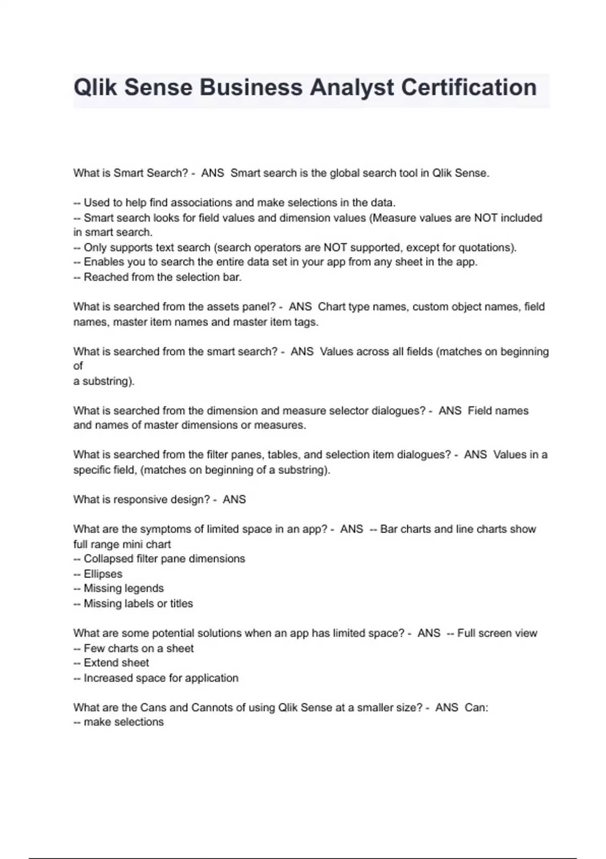 Qlik Sense Business Analyst Certification Exam Questions And Answers What is Smart Search? - ANS Smart search is the global search tool in Qlik Sense. -- Used to help find associations and make selections in the data. -- Smart search looks for field values and dimension values (Measure values are NOT included in smart search. -- Only supports text search (search operators are NOT supported, except for quotations). -- Enables you to search the entire data set in your app from any sheet in the app. -- Reached from the selection bar. What is searched from the assets panel? - ANS Chart type names, custom object names, field names, master item names and master item tags. What is searched from the smart search? - ANS Values across all fields (matches on beginning of a substring). What is searched from the dimension and measure selector dialogues? - ANS Field names and names of master dimensions or measures.