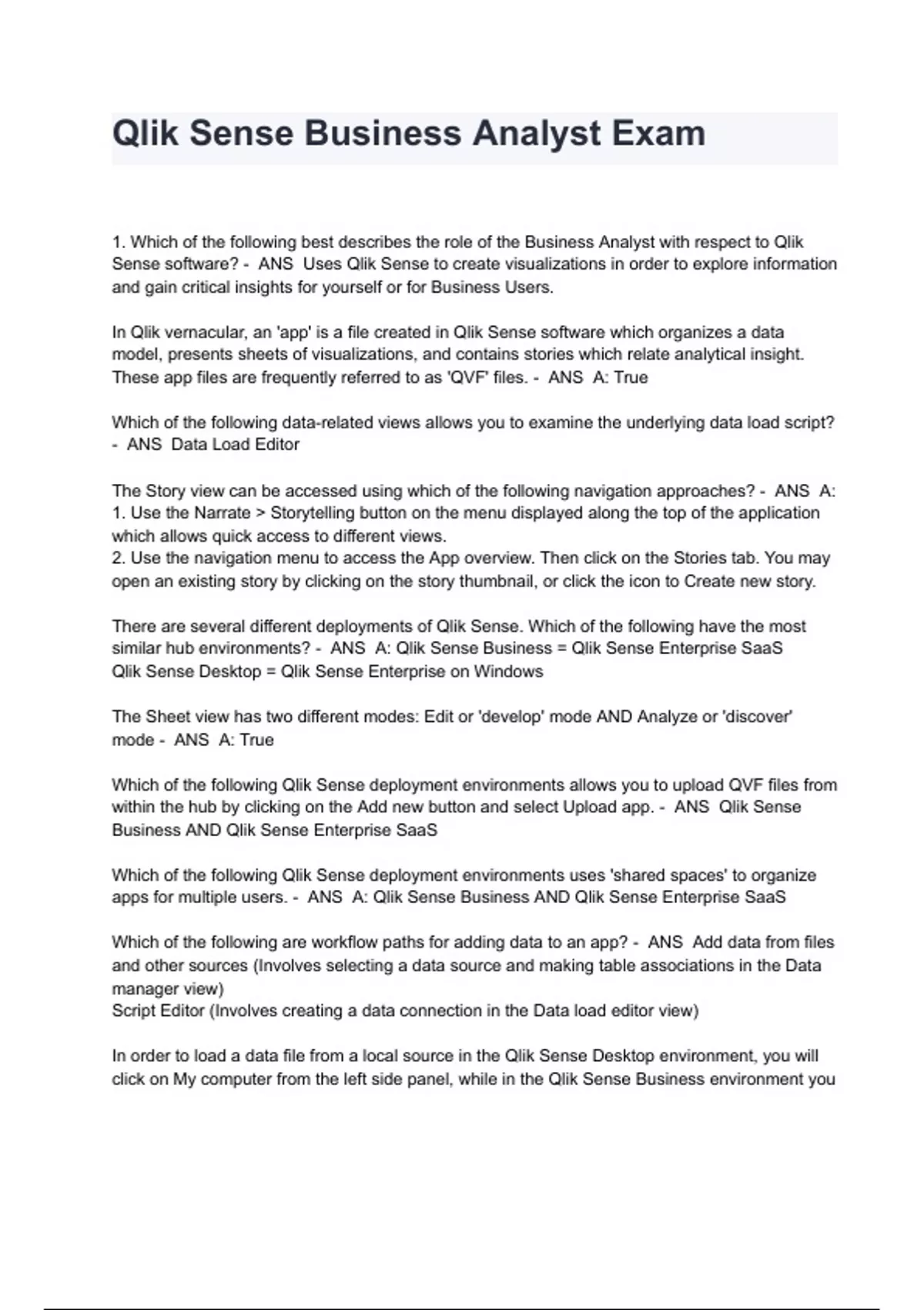 Qlik Sense Business Analyst Exam Questions And Answers 1. Which of the following best describes the role of the Business Analyst with respect to Qlik Sense software? - ANS Uses Qlik Sense to create visualizations in order to explore information and gain critical insights for yourself or for Business Users. In Qlik vernacular, an 'app' is a file created in Qlik Sense software which organizes a data model, presents sheets of visualizations, and contains stories which relate analytical insight. These app files are frequently referred to as 'QVF' files. - ANS A: True Which of the following data-related views allows you to examine the underlying data load script? - ANS Data Load Editor The Story view can be accessed using which of the following navigation approaches? - ANS A: 1. Use the Narrate > Storytelling button on the menu displayed along the top of the application which allows quick access to different views. 2. Use the navigation menu to access the App overview. Then click on the Stories tab. You may open an existing story by clicking on the story thumbnail, or click the icon to Create new story. There are several different deployments of Qlik Sense. Which of the following have the most similar hub environments? - ANS A: Qlik Sense Business = Qlik Sense Enterprise SaaS Qlik Sense Desktop = Qlik Sense Enterprise on Windows The Sheet view has two different modes: Edit or 'develop' mode AND Analyze or 'discover' mode - ANS A: True Which of the following Qlik Sense deployment environments allows you to upload QVF files from within the hub by clicking on the Add new button and select Upload app. - ANS Qlik Sense Business AND Qlik Sense Enterprise SaaS