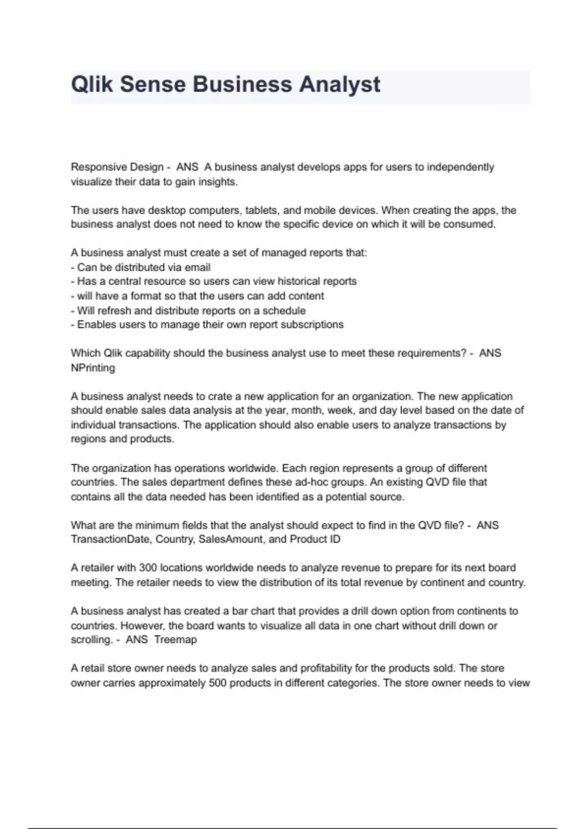 Qlik Sense Business Analyst Exam Questions And Answers Responsive Design - ANS A business analyst develops apps for users to independently visualize their data to gain insights. The users have desktop computers, tablets, and mobile devices. When creating the apps, the business analyst does not need to know the specific device on which it will be consumed. A business analyst must create a set of managed reports that: - Can be distributed via email - Has a central resource so users can view historical reports - will have a format so that the users can add content - Will refresh and distribute reports on a schedule - Enables users to manage their own report subscriptions Which Qlik capability should the business analyst use to meet these requirements? - ANS NPrinting A business analyst needs to crate a new application for an organization. The new application should enable sales data analysis at the year, month, week, and day level based on the date of individual transactions. The application should also enable users to analyze transactions by regions and products. The organization has operations worldwide. Each region represents a group of different countries. The sales department defines these ad-hoc groups. An existing QVD file that contains all the data needed has been identified as a potential source.