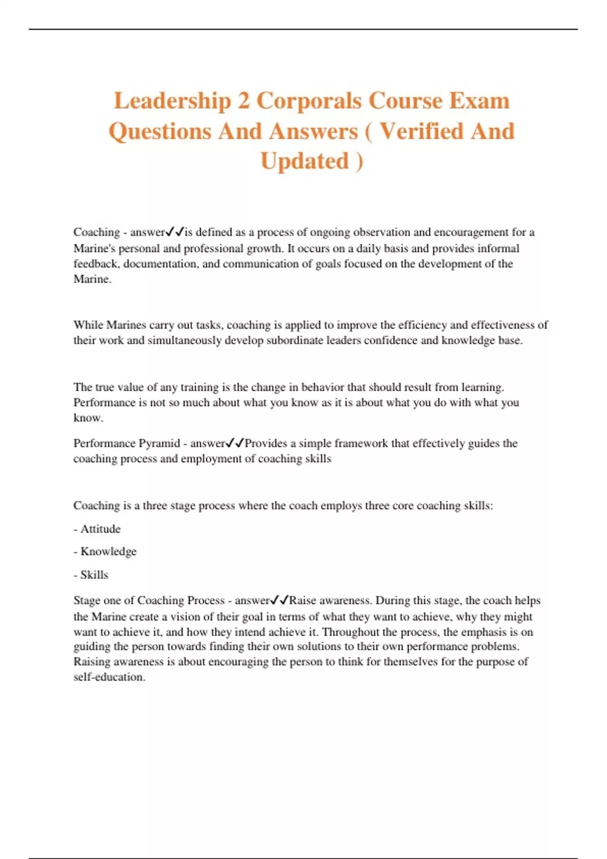 Leadership 2 Corporals Course Exam Questions And Answers ( Verified And Updated ) Coaching - answeris defined as a process of ongoing observation and encouragement for a Marine's personal and professional growth. It occurs on a daily basis and provides informal feedback, documentation, and communication of goals focused on the development of the Marine. While Marines carry out tasks, coaching is applied to improve the efficiency and effectiveness of their work and simultaneously develop subordinate leaders confidence and knowledge base. The true value of any training is the change in behavior that should result from learning. Performance is not so much about what you know as it is about what you do with what you know. Performance Pyramid - answerProvides a simple framework that effectively guides the coaching process and employment of coaching skills Coaching is a three stage process where the coach employs three core coaching skills: - Attitude - Knowledge - Skills Stage one of Coaching Process - answerRaise awareness. During this stage, the coach helps the Marine create a vision of their goal in terms of what they want to achieve, why they might want to achieve it, and how they intend achieve it. Throughout the process, the emphasis is on guiding the person towards finding their own solutions to their own performance problems. Raising awareness is about encouraging the person to think for themselves for the purpose of self-education. Stage two of Coaching Process - answerGenerate responsibility. During this stage, the coach challenges the person to take action to make their goals reality, while ascertaining their readiness to do so. Generating responsibility is about improving self-motivation. Stage three of Coaching Process - answerFacilitate performance. This stage is accomplished by supporting the Marine in dealing with the challenges of making their goal a reality for the purpose of self-actualization. The principles that guide this stage are: - Autonomy: the Marine has professional freedom to choose the course of action they feel best meets their needs in accomplishing their goals. - Responsibility: the Marine is responsible for the choices they make. - Accountability: the Marine is accountable for what they do and the results they get. These principles enable Marines to own the process and the product of their success. Vision - answerHelp your Marines to visualize their goals. Challenge - answerChallenge your Marines to take the necessary action to achieve their goals. Support - answerSupport your Marines throughout the process of achieving their goals. Open-Ended and Closed-Ended - answerAsk open-ended questions like: "What do you think?" or "How do you think we should approach this?" •Open-ended questions can be used to invite a free response from subordinate leaders without revealing the senior's point of view. -Ex: "How is work going?" or "Why do you think that approach didn't work?" Asking closed-ended questions will lead to a yes or no answer like: "Did you take the test?" • By itself, the question leads no further. It may point the way to another question. For example, if the answer is yes, the next question might be, "Did you pass?"