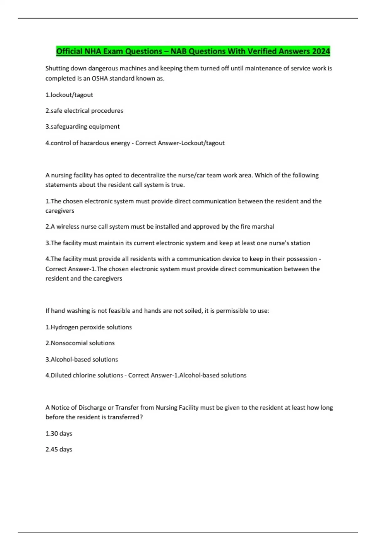 Official NHA Exam Questions – NAB Questions With Verified Answers 2024 Shutting down dangerous machines and keeping them turned off until maintenance of service work is completed is an OSHA standard known as. ut/tagout electrical procedures uarding equipment ol of hazardous energy - Correct Answer-Lockout/tagout A nursing facility has opted to decentralize the nurse/car team work area. Which of the following statements about the resident call system is true. 1.The chosen electronic system must provide direct communication between the resident and the caregivers 2.A wireless nurse call system must be installed and approved by the fire marshal 3.The facility must maintain its current electronic system and keep at least one nurse's station 4.The facility must provide all residents with a communication device to keep in their possession - Correct Answer-1.The chosen electronic system must provide direct communication between the resident and the caregivers If hand washing is not feasible and hands are not soiled, it is permissible to use: 1.Hydrogen peroxide solutions 2.Nonsocomial solutions 3.Alcohol-based solutions 4.Diluted chlorine solutions - Correct Answer-1.Alcohol-based solutions A Notice of Discharge or Transfer from Nursing Facility must be given to the resident at least how long before the resident is transferred?...