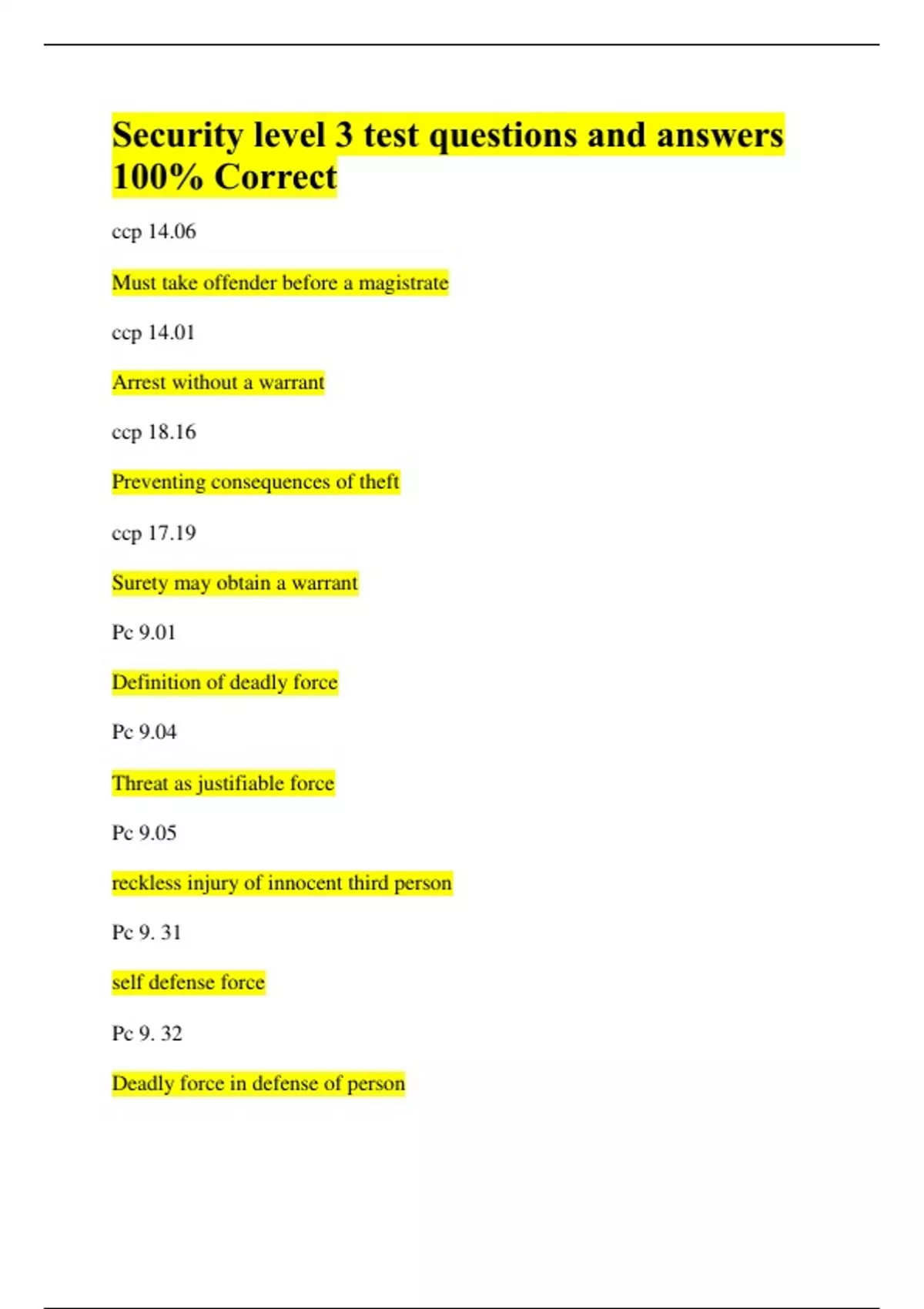 Security level 3 test questions and answers 100% Correct ccp 14.06 Must take offender before a magistrate ccp 14.01 Arrest without a warrant ccp 18.16 Preventing consequences of theft ccp 17.19 Surety may obtain a warrant