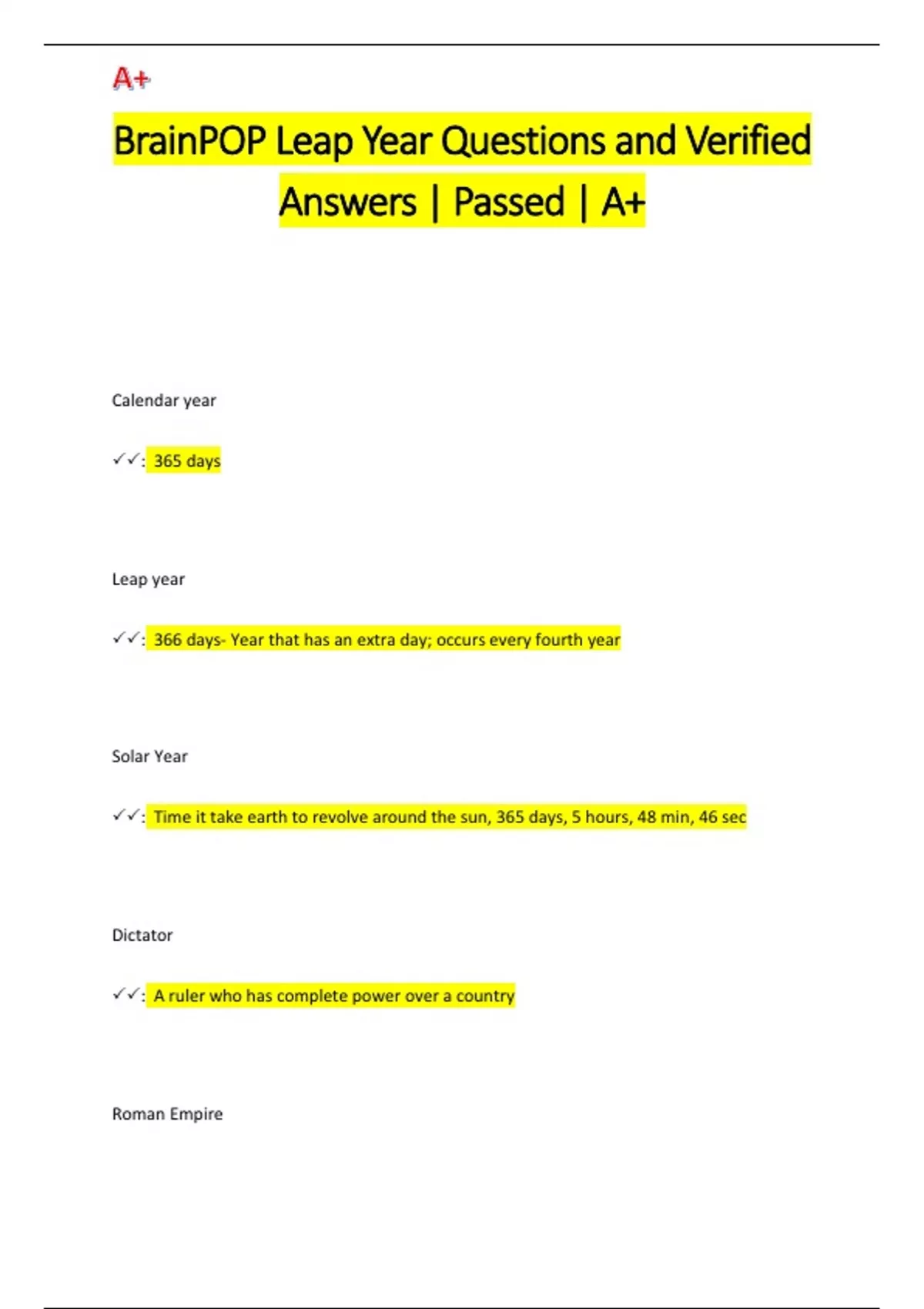 BrainPOP Leap Year Questions and Verified Answers | Passed | A+